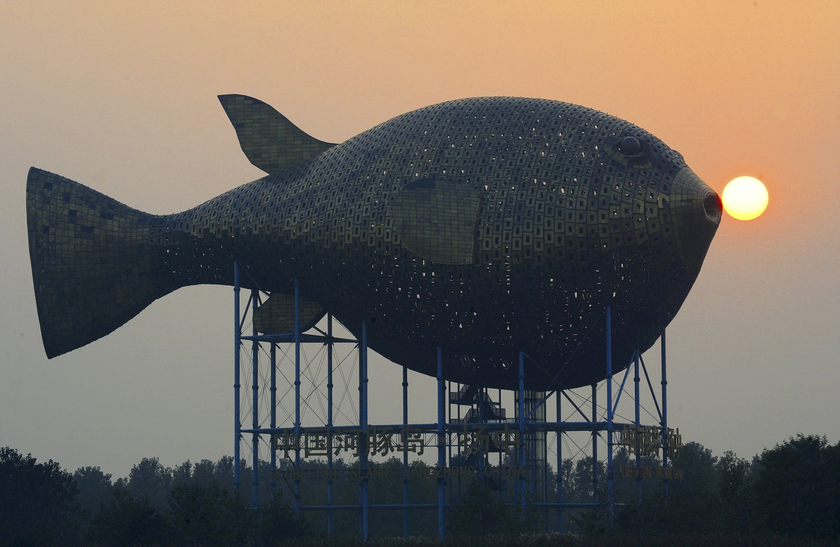 Солнце садится за смотровой башней в форме гигантской рыбы на берегу реки в округе Янгчонг провинции Цзянсу, Китай. Башня состоит из 8 920 медных пластин, она имеет высоту 15 метров. Ее изготовление стоило около 70 млн юаней ($ 11,4 млн). / © Reuters
