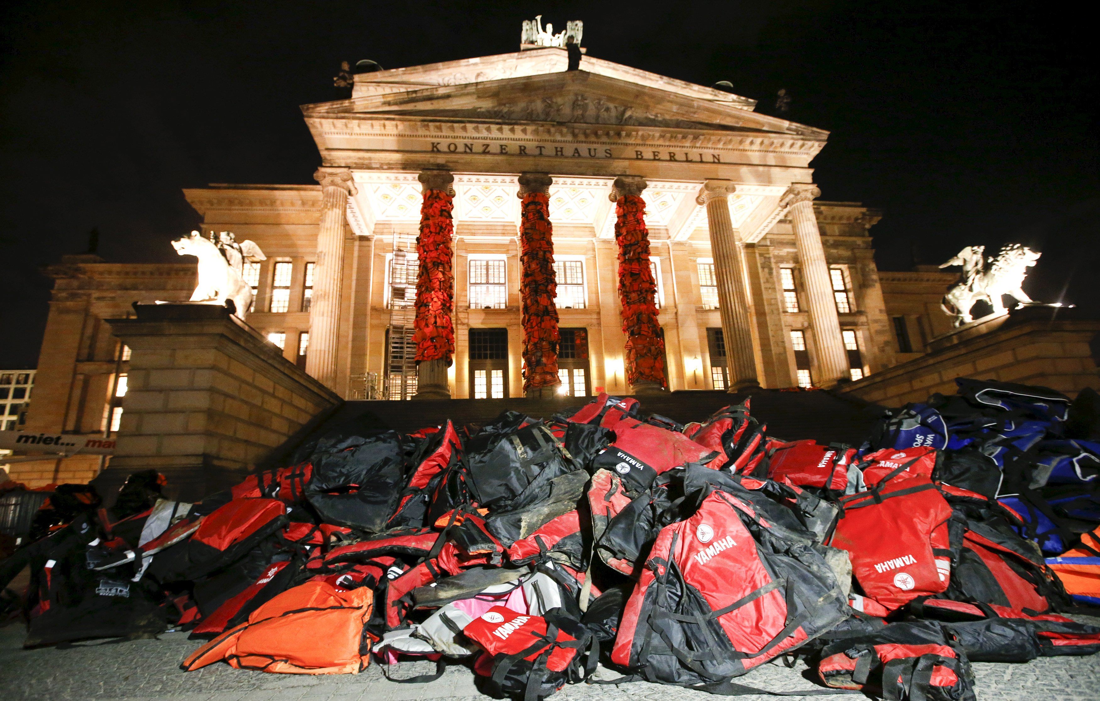 Спасательные жилеты, оставленные мигрантами на греческих пляжах, изображены в концертном зале в Берлине в качестве временного мемориального проекта в память о беженцах, утонувших по пути в Европу. Китайский художник Ай Вэйвэй использовал около 14 000 выброшенных спасательных жилетов, которые он получил от власти греческого острова Лесбос. / © Reuters