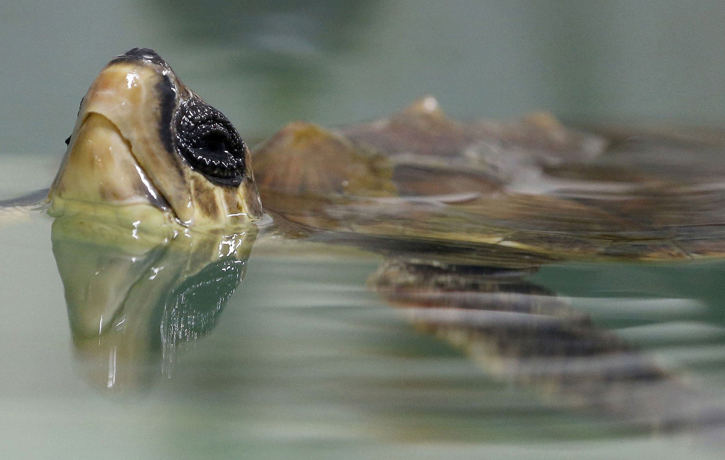 Черепаху видно в центре помощи для морских черепах в аквариуме Ла-Рошель, Франция. Сотрудники центра занимаются морскими черепахами, которых выбросило на пляжи после зимних штормов. / © Reuters