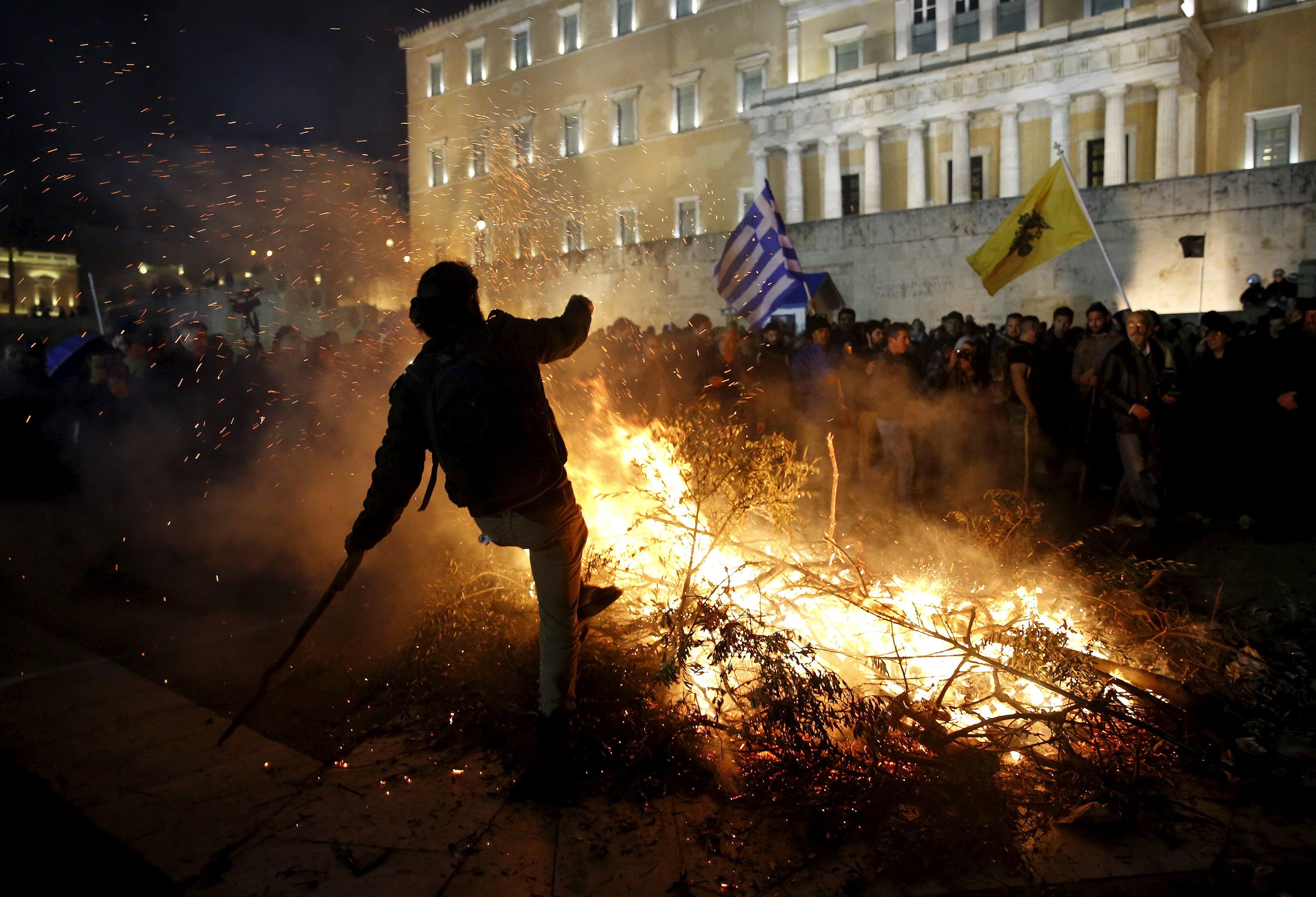 Фермеры жгут костры у здания парламента в Афинах во время акции протеста против планируемых пенсионных реформ. / © Reuters