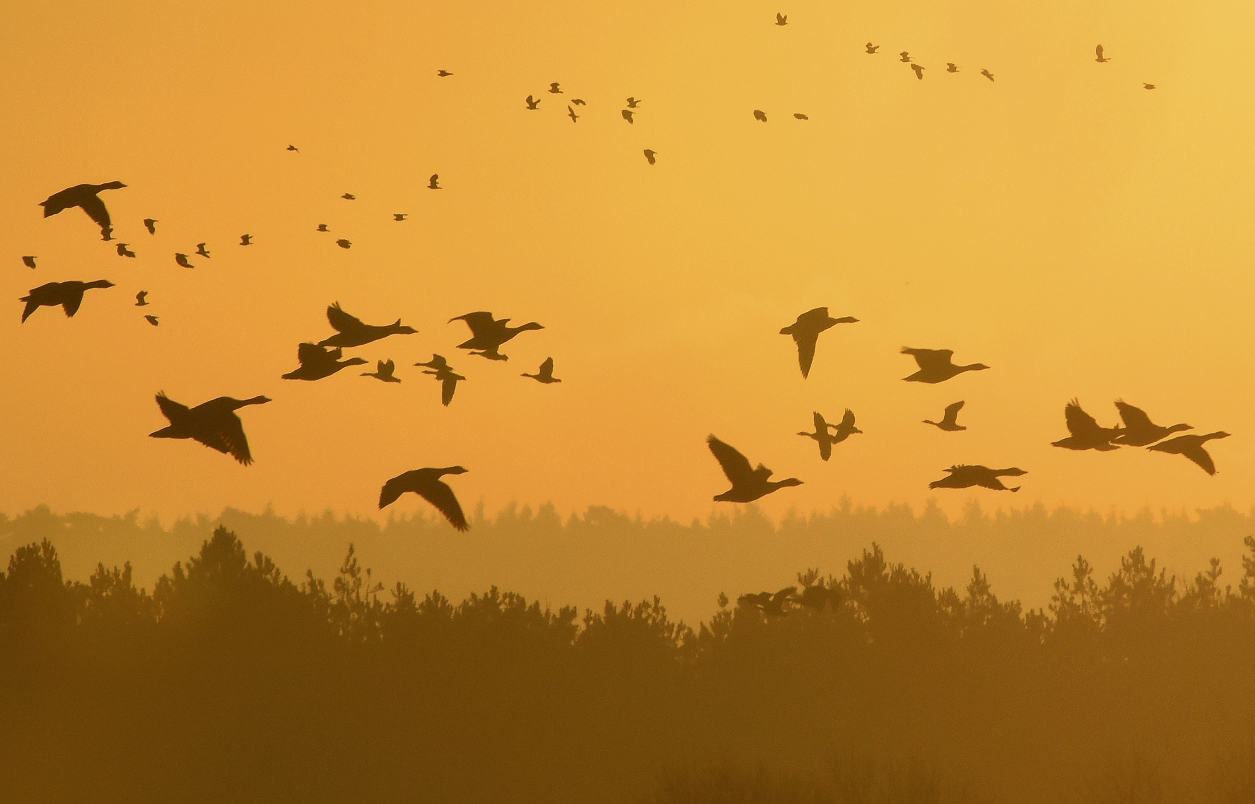 Стаи гусей летят на рассвете вдоль береговой линии в восточной Великобритании. / © Reuters