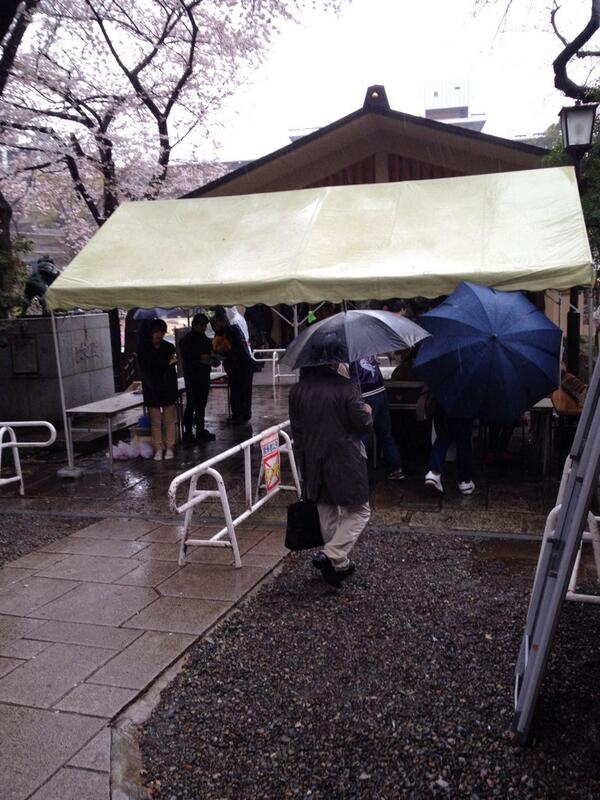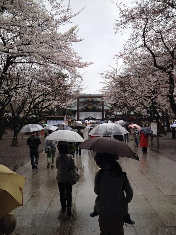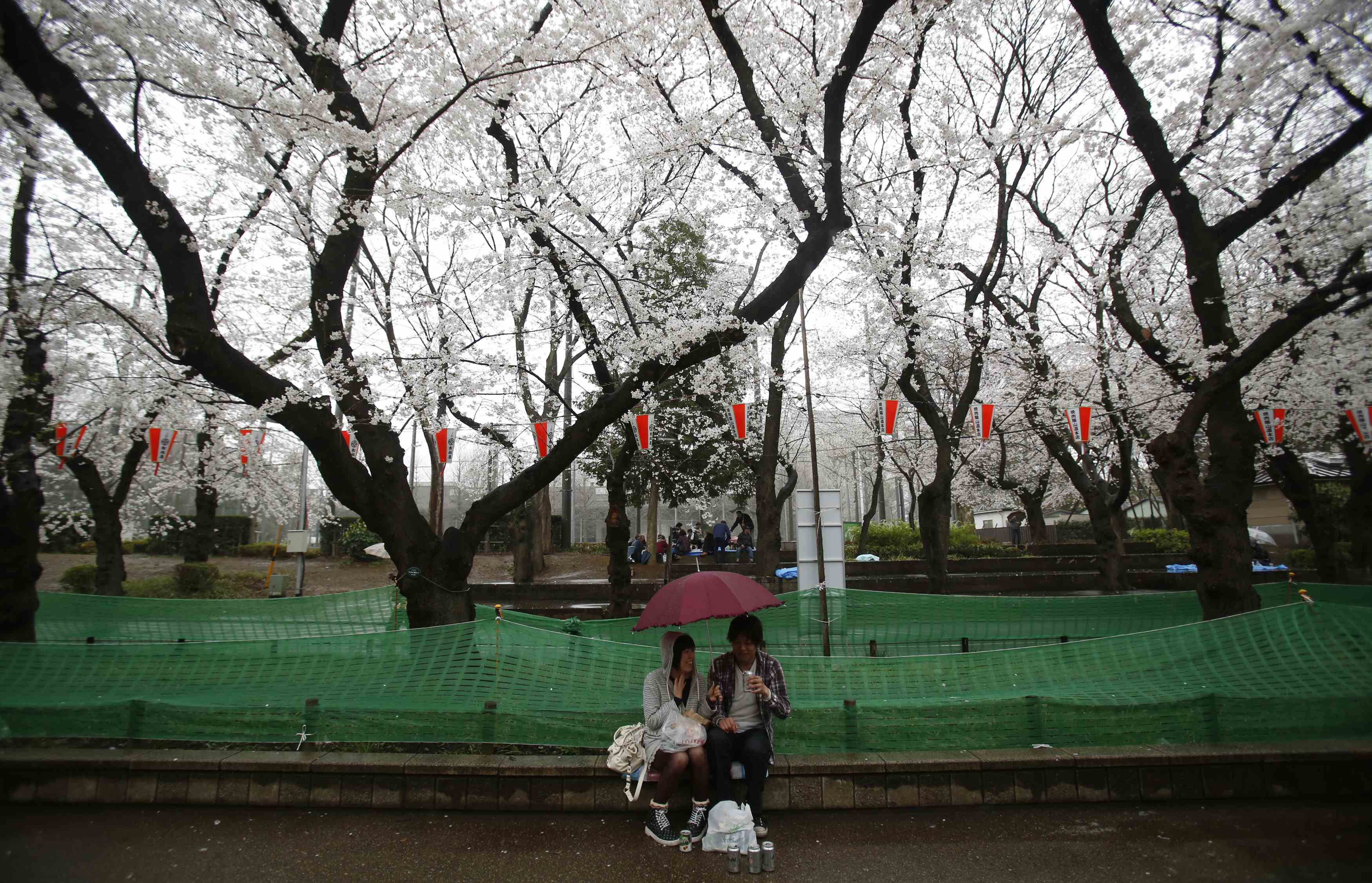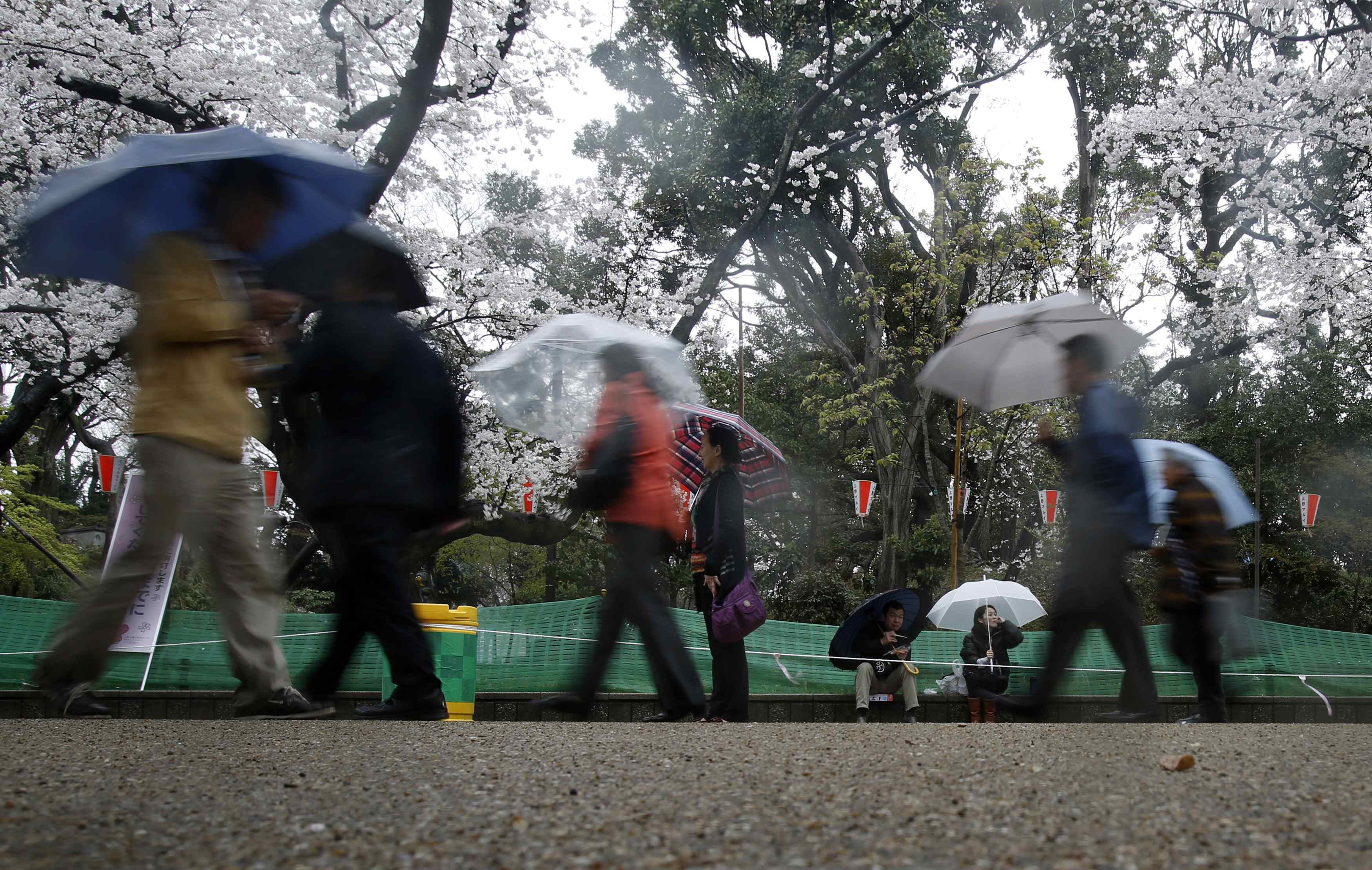 В эти дни в Токио погода не способствовала прогулкам, ведь было пасмурно и шли дожди. Но японцев плохая погода не отпугнула - вооружившись зонтиками, они отправлялись в традиционные прогулки под цветущими вишнями.