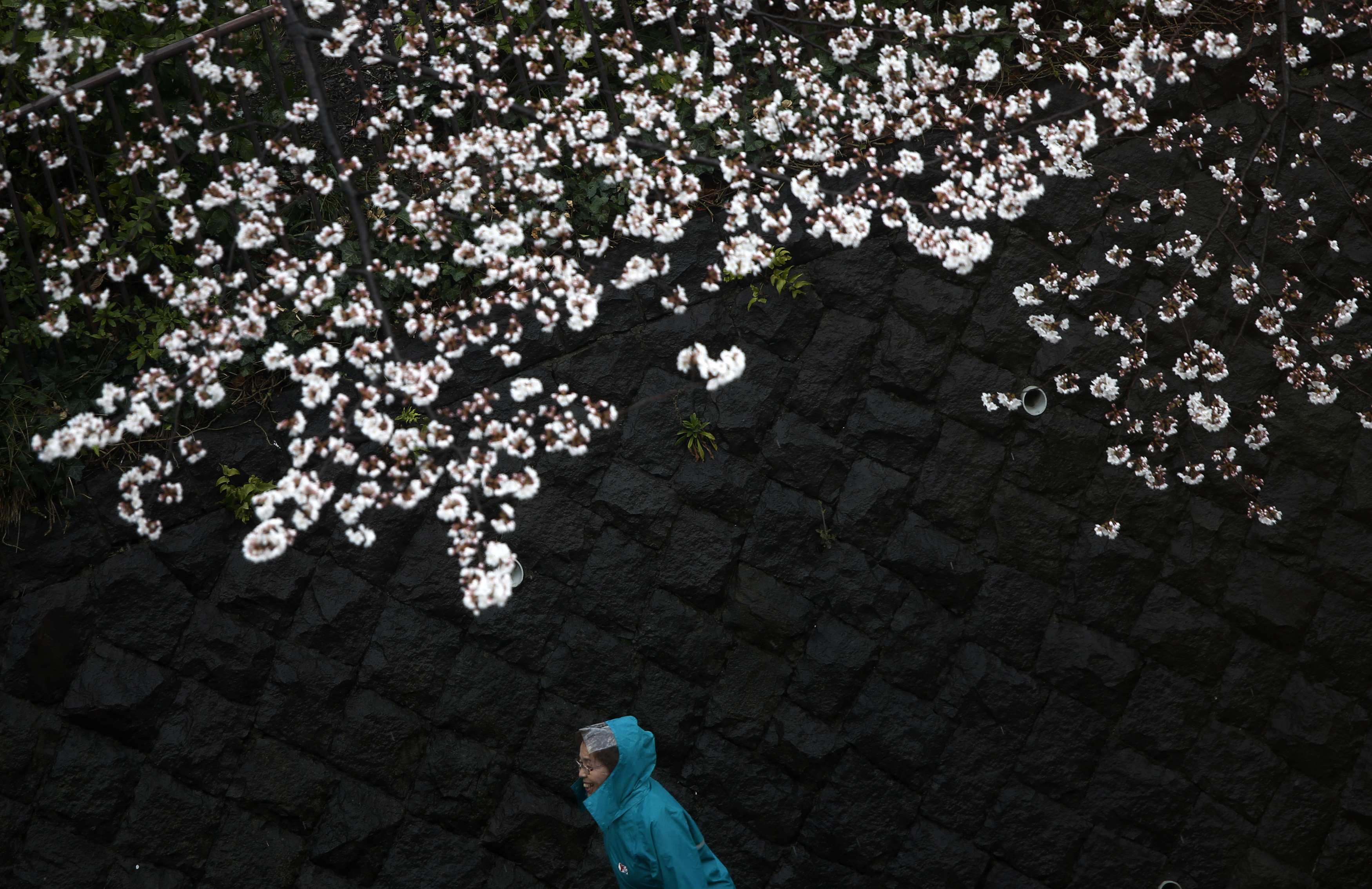 Японцы под дождем наслаждаются великолепным весенним цветением сакуры