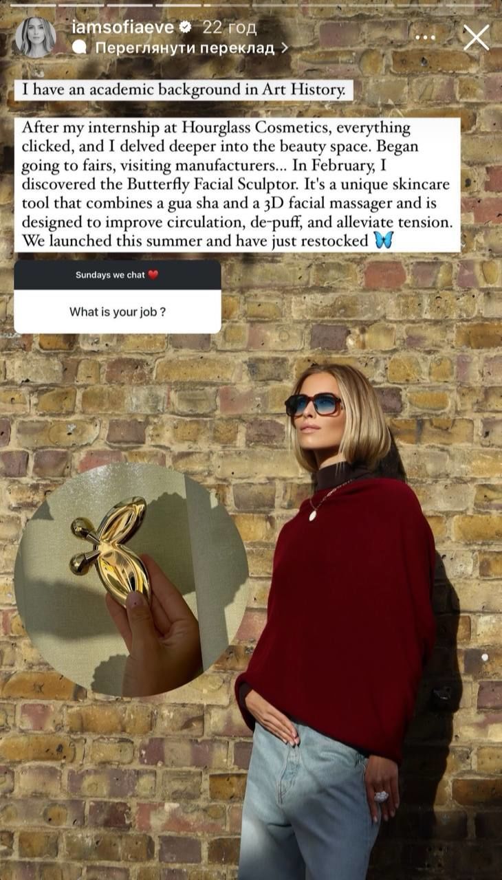 "После моей стажировки в Hourglass Cosmetics, я осознала, что хочу больше погрузиться в пространство красоты. Начала ездить по ярмаркам, посещать фабрики... В феврале открытием для меня стал скульптор лица "бабочка". Это уникальный инструмент по уходу за кожей, который объединяет ГуаШа и 3D-массажёр для лица и предназначается для улучшения кровообращения и снятия напряжения. Мы запустились этим летом", - написала внучка певицы в фотоблоге.