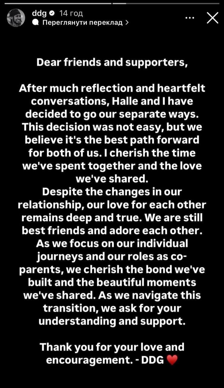 "Уважаемые друзья и поклонники, после долгих раздумий и душевных разговоров, мы с Холли решили пойти разными путями. Это решение было нелегким, но мы считаем, что это лучший будущий путь для нас обоих. Я ценю время, которое мы провели вместе и любовь, которую мы делили. Несмотря на перемены в наших отношениях, наша любовь друг к другу остается глубокой и настоящей. Мы все еще лучшие друзья и обожаем друг друга. Поскольку мы сосредотачиваемся на наших отдельных историях и роли родителей, мы ценим связь, которую мы построили, и прекрасные моменты, которые мы имели. В этот период просим о понимании и поддержке. Спасибо за вашу любовь и воодушевление", - написал DDG.