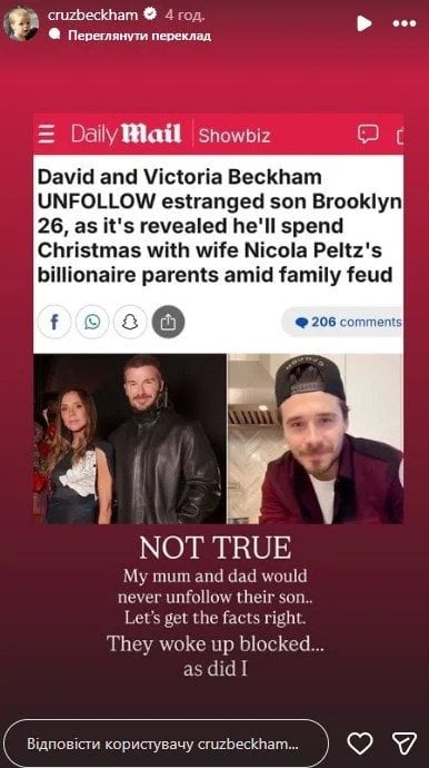 Круз Бекхэм оперативно отреагировал на новость, а именно на слухи о том, что якобы сами родители прекратили следить за сыном. В сториз он подчеркнул, что это Бруклин заблокировал их в соцсетях, а не наоборот: «Мама и папа никогда бы не отписались от своего сына. Они проснулись заблокированными, как и я».