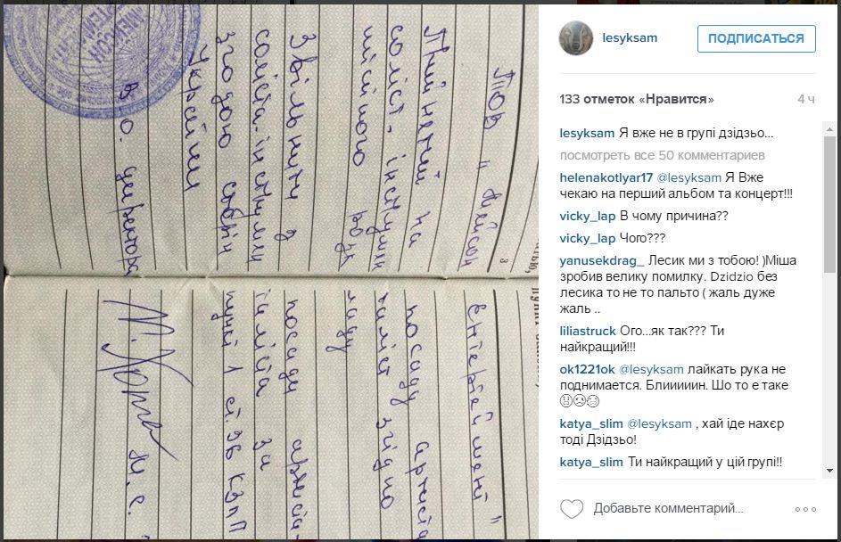 "Дзидзьо уволил Лесика из группы DZIDZiO", "Я уже не в группе DZIDZiO..." - такими подписями сопроводил фотографии Лесик.