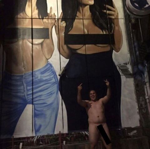К слову, один из толстопузых мужчин, которые ранее высмеяли "обнаженное" селфи Кардашян, и на этот раз не упустил свой шанс. Так, абсолютно голый мужчина не слишком спортивного телосложения сфотографировался посто на фоне мурала с Ким и Эмили.