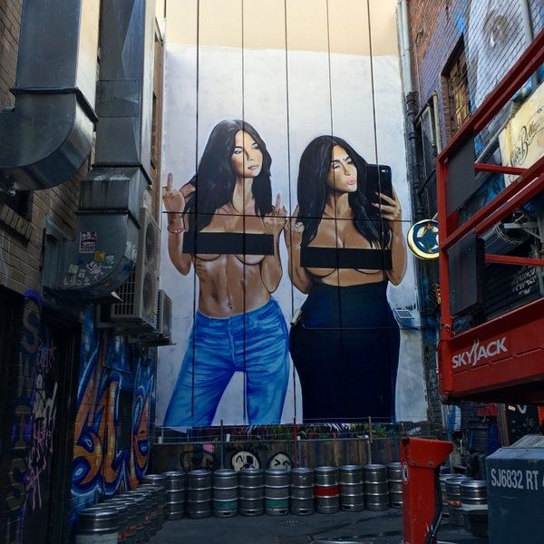 Так, дуэтное фото в стиле "ню" Ким и Эмили перенесли на стену здания, которое расположено в переулке Мельбурна, Австралия.