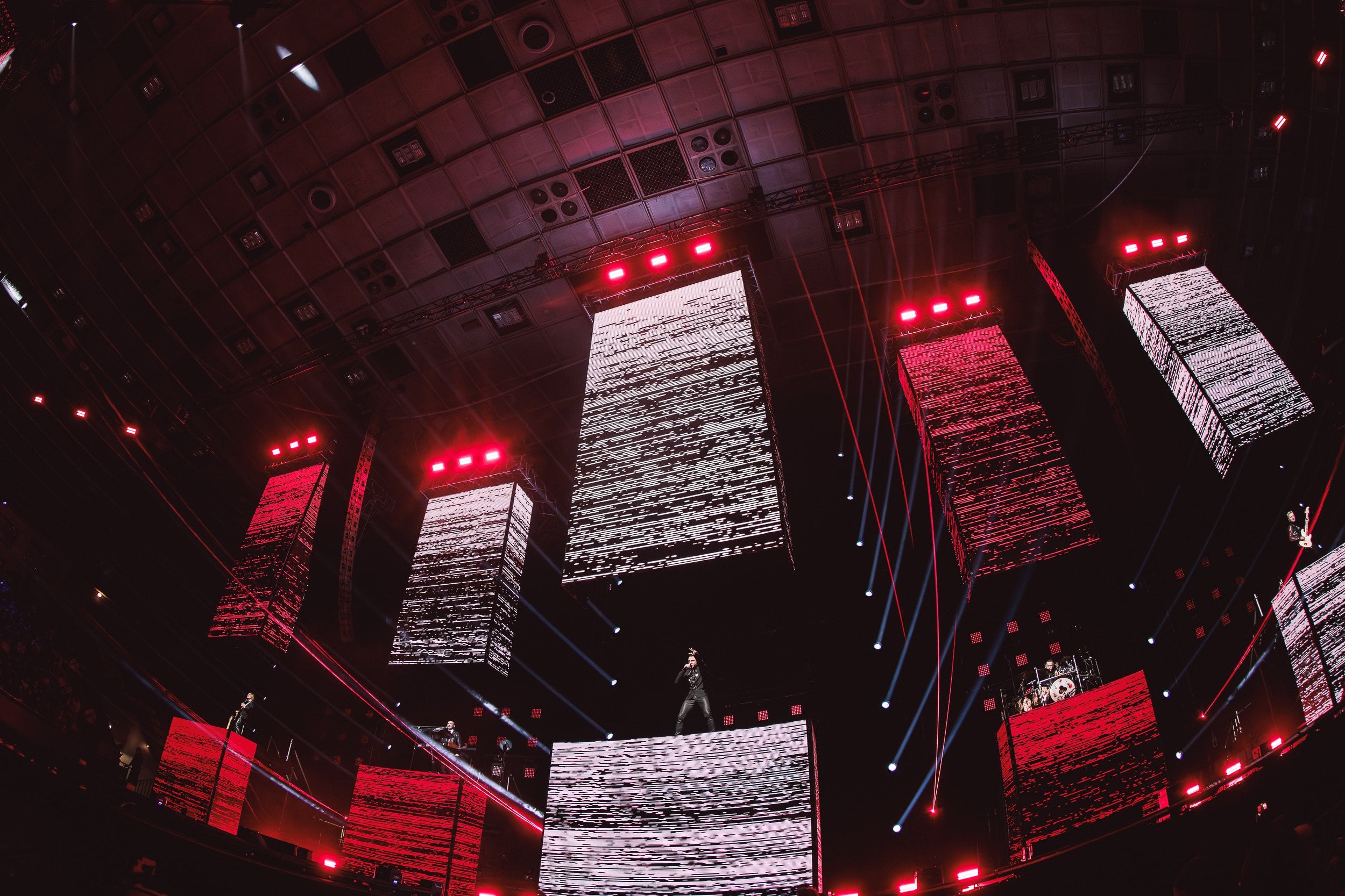 Далее стартовало шоу с эффектного появления музыкантов на пяти световых башнях. В целом, визуальная часть построена по принципам современных европейских лайв-продакшенов: сложная сценография, около 50 экранов в форме кубов и более 500 световых приборов, синхронизированных в единую систему.