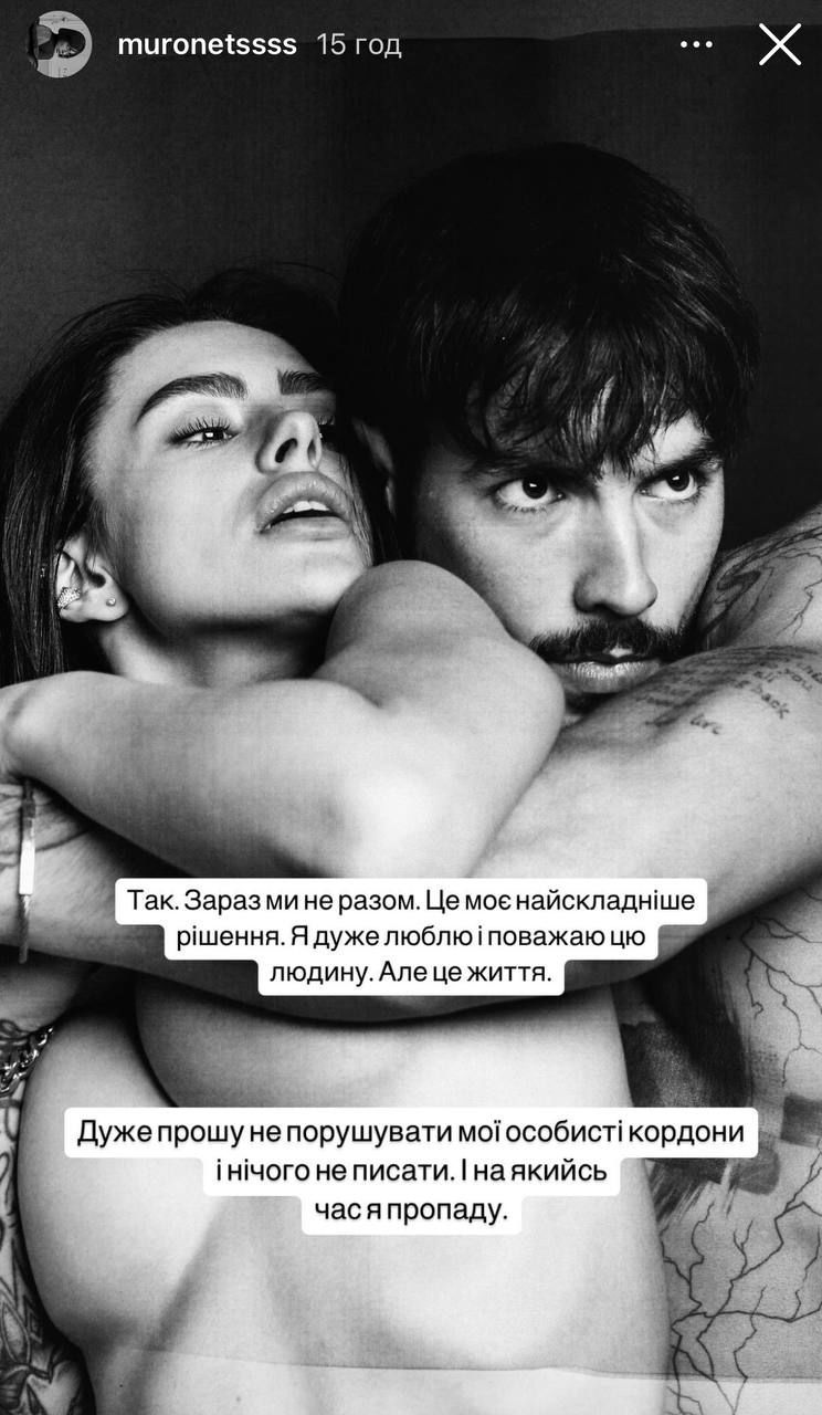 "Да. Сейчас мы не вместе. Это мое самое сложное решение. Я очень люблю и уважаю этого человека. Но это жизнь. Очень прошу не нарушать мои личные границы и ничего не писать. И на время я исчезну", — написала Муронец.
