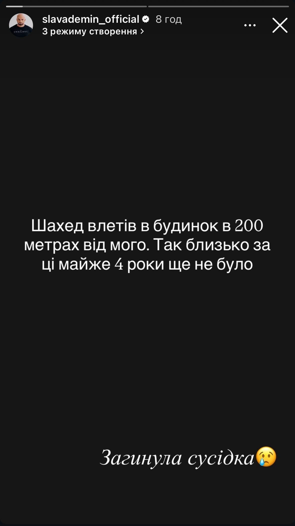 Так, в ночь на 23 декабря Украина снова оказалась под массированным ударом со стороны России. Демин в фотоблоге сообщил, что буквально в нескольких сотнях метров от его дома попал ударный дрон-камикадзе. Настолько близко, признается он, опасность еще не подбиралась за все время полномасштабной войны. К сожалению, россияне отобрали жизнь у соседки ведущего.