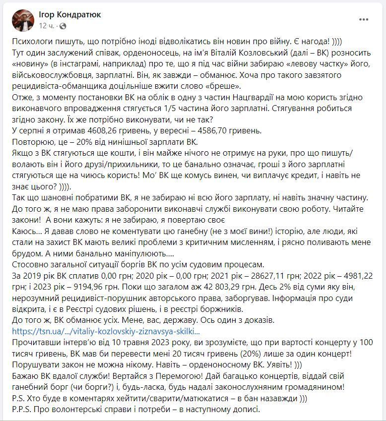 Пост Игоря Кондратюка / © facebook.com/kondratjukigor