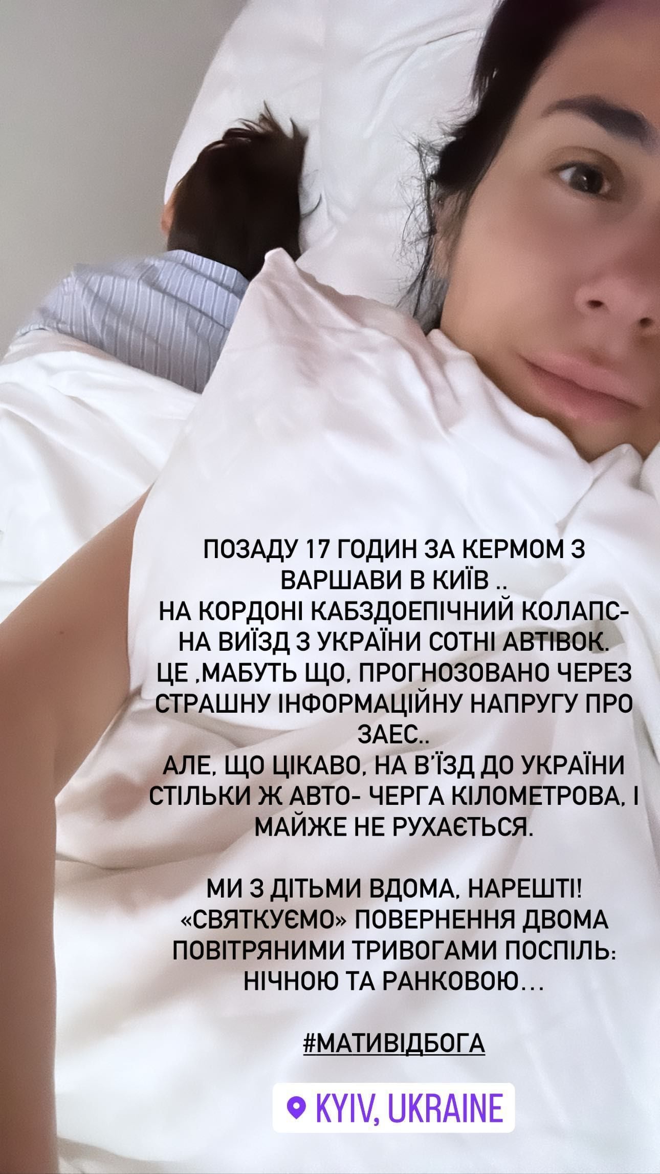 "Сзади 17 часов за рулем из Варшавы в Киев. На границе кабздоэпический коллапс — на выезд из Украины сотни автомобилей. Это, пожалуй, прогнозируемо из-за страшного информационного напряжения о ЗАЭС. Но, что интересно, на въезд в Украину столько же авто "Очередь километровая, и почти не двигается. Мы с детьми дома, наконец! "Празднуем" возвращение двумя воздушными тревогами подряд: ночной и утренней", — написала Маша.