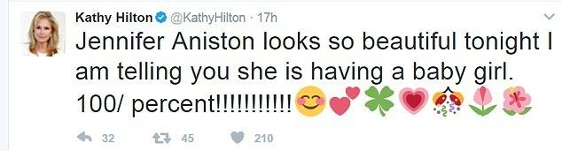 "Дженнифер Анистон такая красивая сегодня, и я вам говорю, она ждет девочку, 100%!" - подчеркнула Кэтти, но впоследствии удалила свое сообщение.
