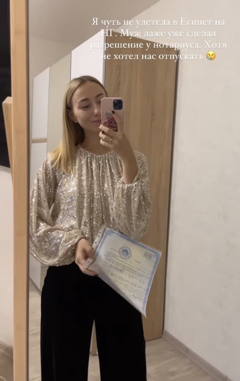 "Я едва не полетела в Египет на Новый год. Муж даже уже сделал разрешение у нотариуса. Хотя не хотел нас отпускать", — написала она и показалась с документом.