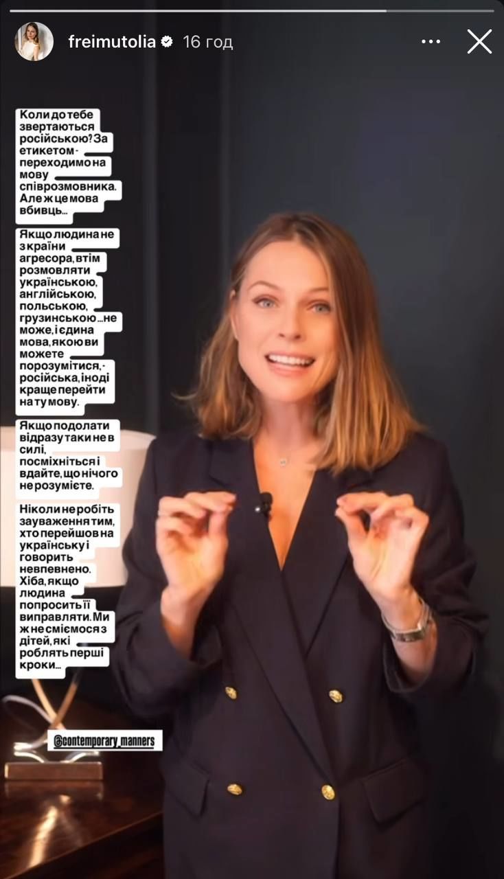 "Никогда не делайте замечания тем, кто перешел на украинский и говорит неуверенно. Разве, если человек просит его исправлять. Мы же не смеемся над детьми, которые делают первые шаги", — отметила Фреймут.