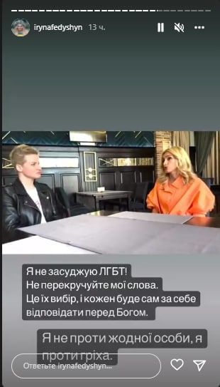 "Я не осуждаю ЛГБТ. Не коверкайте мои слова. Это их выбор, и каждый будет сам за себя отвечать перед Богом. Я не против ни одного человека, я против греха", — добавила Федишин.