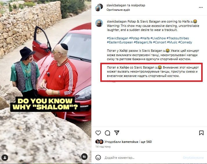 Однако, пользователи больше обратили на пост под видео. Там тоже указывалась информация о предстоящем концерте Потапа, да еще и на трех языках – английском, украинском и почему-то русском.