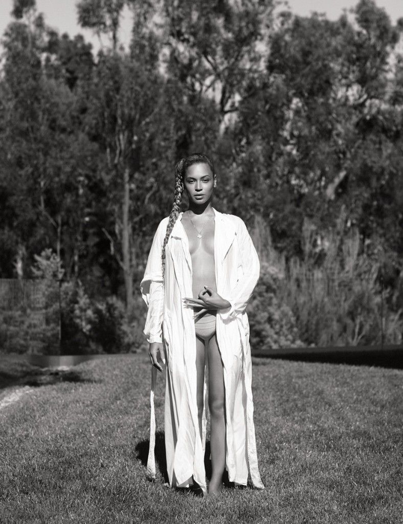 На фото Бейонсе позирует в нижнем белье телесного цвета, а иногда и без него, однако пикантные места звезда прикрывает пальто.