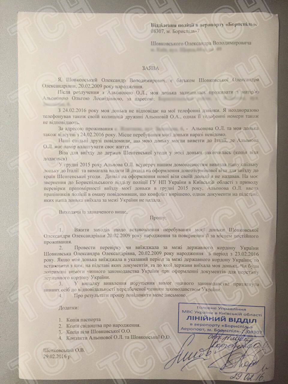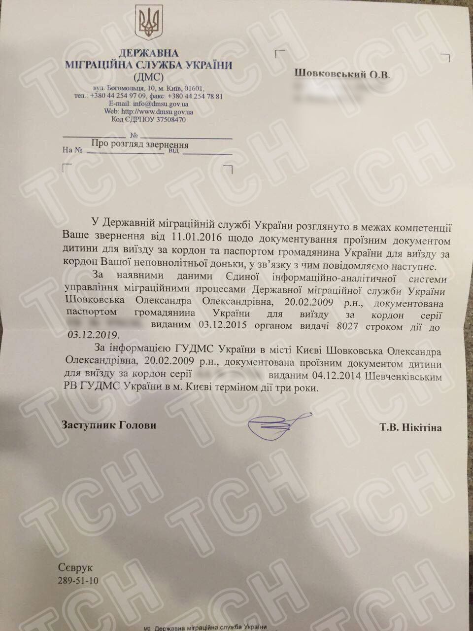 Кроме того, Шовковский предоставил ТСН документ от Государственной миграционной службы в отношении его обращения от 11-го января 2016-го года о документировании проездным документом ребенка для выезда за границу.