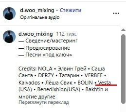 Соответствующую информацию обнародовал блогер-сплетник Богдан Беспалов в своем Telegram-канале. Речь идет о звукорежиссере и саундпродюсере D.Woo, в профиле которого в Instagram указано, что он живет в РФ и сотрудничает с россиянами, среди которых и Леша Свик, который поддерживает войну и политику путина.