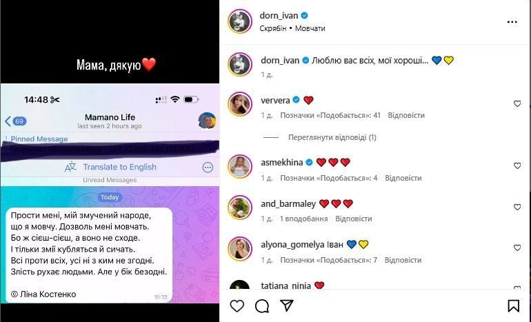 Артист, который недавно выступал в компании россиян, вышел на связь и заговорил по-украински. В Instagram Дорн опубликовал скриншот переписки с мамой в мессенджере. Он показал, как родной человек прислал ему фрагмент из стихотворения Лины Костенко "Прости мені, мій змучений народе". Вероятно, этим отрывком мама звезды пыталась намекнуть, что сюжет тесно переплетается с его жизнью.