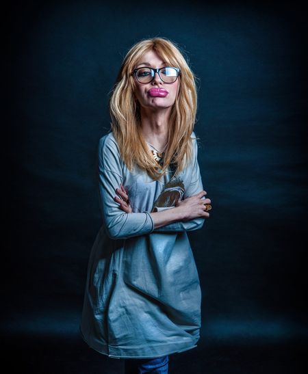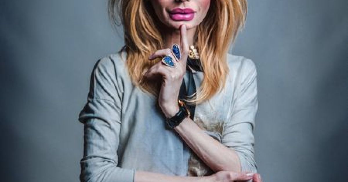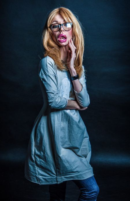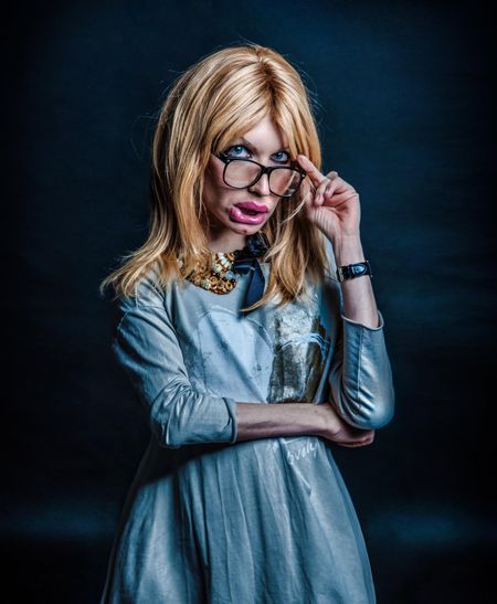 На фото травести-дива предстает в голубом пальто, с пышной прической и ... гигантскими губами.