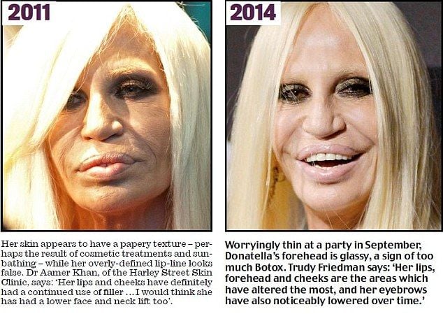 "Ее кожа очень блестящая, что является симптомом слишком большого количества ботокса и лазерной шлифовки, которая используется для эффекта гладкой кожи. Я думаю, что в ее нижней челюсти был имплантат, о чем говорит потеря костной массы", - прокомментировал внешность Версаче доктор Амер Хан. Поклонники Донателлы очень надеются, что она прекратит издевательства над собой, ведь переживают за ее здоровье.