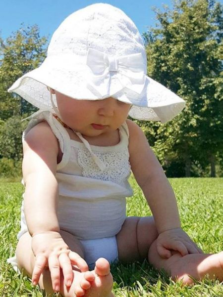 На фото маленькая Кая Евдокия изображена сидя на траве в смешной шляпке с бабочкой и сосредоточенно разглядывая свою ножку.