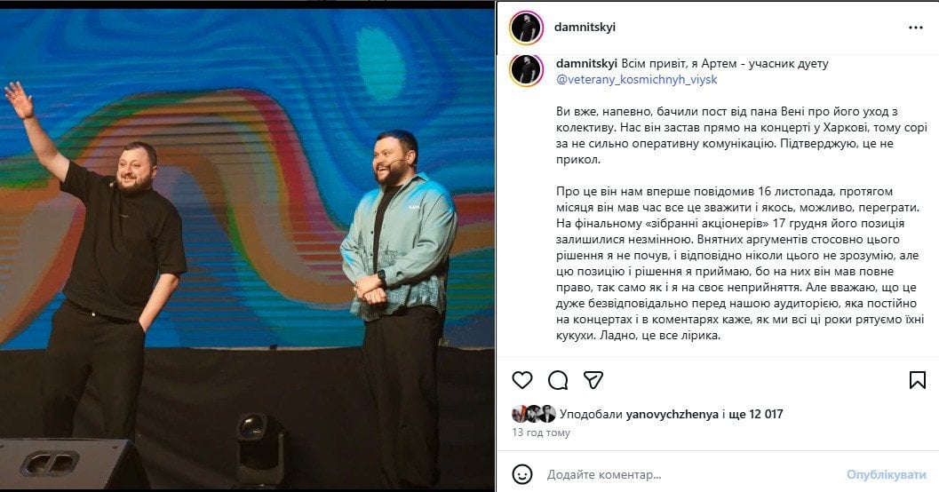 «Вы уже, наверное, видели пост от господина Вени о его выходе из коллектива. Нас он застал прямо на концерте в Харькове. Внятных аргументов относительно этого решения я не услышал, и соответственно никогда этого не пойму, но эту позицию и решение я принимаю, потому что на них он имел полное право, так же как и я на свое неприятие. Но считаю, что это очень безответственно перед нашей аудиторией, которая постоянно на концертах и в комментариях говорит, как мы все эти годы спасаем их кукухи. Ладно, это все лирика. Далее все по своим делам. Что касается планов господина Вени — это лучше вам спросить у него, с нами он ими не делился», — резко написал Дамницкий.