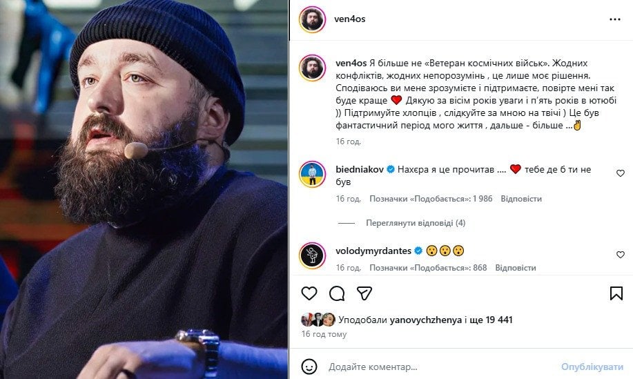«Я больше не „Ветеран космических войск“. Никаких конфликтов, никаких недоразумений. Это только мое решение. Надеюсь вы меня поймете и поддержите, поверьте мне, так будет лучше. Спасибо за восемь лет внимания и пять лет в Ютубе. Поддерживайте ребят, следите за мной. Это был фантастический период моей жизни, дальше — больше», — написал Веня.