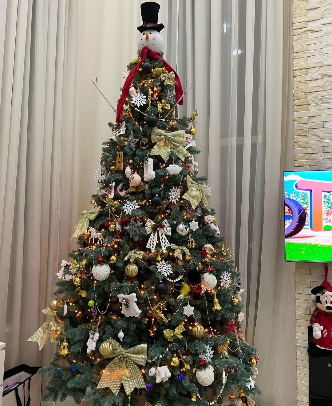 Супруги отдали предпочтение игрушкам в золотистых и белых цветах, а верхушку новогоднего дерева украшает снеговичок.