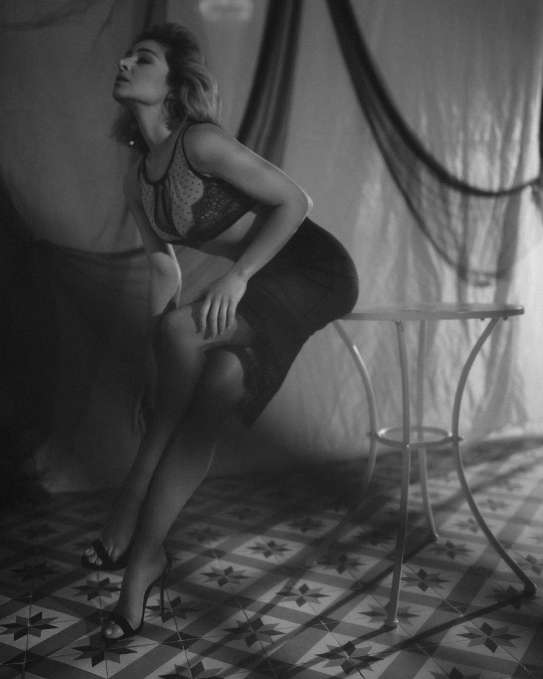 На странице в Instagram исполнительница разместила серию атмосферных черно-белых снимков, на которых предстает в кружевном нижнем белье. Наряд артистки прекрасно подчеркнул ее стройную фигуру и аппетитные изгибы тела.