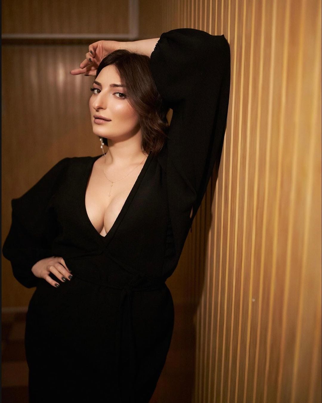 В фотоблоге участница шоу "Танцы со звездами" запостила серию снимков, на которых соблазнительно позировала в роскошном черном платье с глубоким декольте. Так, фигуристая актриса засветила пышную грудь.