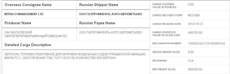 Согласно его материалам, кроме операций с продуктами, в соответствии с таможенным данным, Intraco Management Ltd также значится как получатель керосина для авиа судов. В частности, в октябре 2014 года оффшор купил 500 тонн авиатоплива у российской дочерней компании российского Газпрома - Газпромнефть-АЭРО Шереметьево.