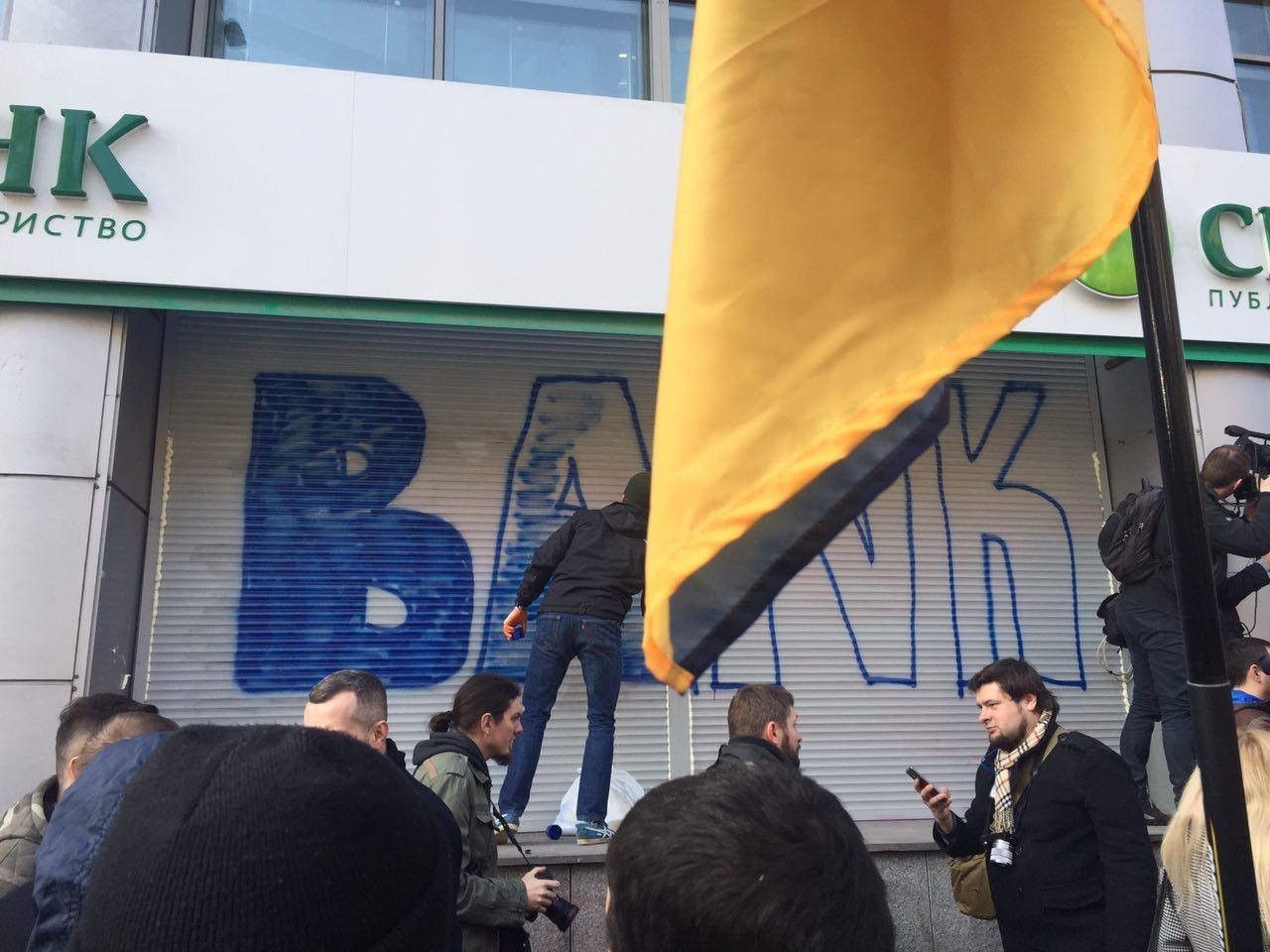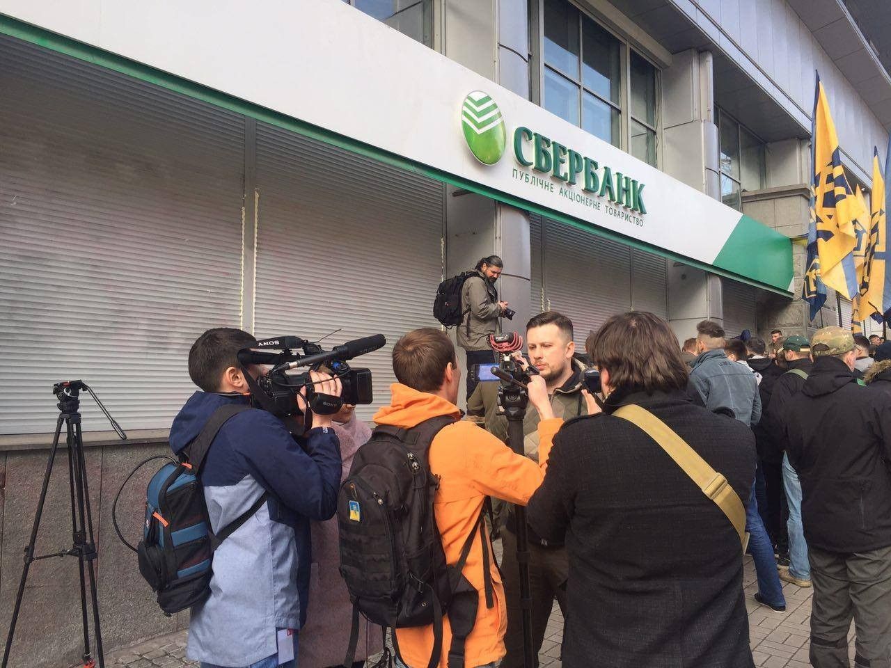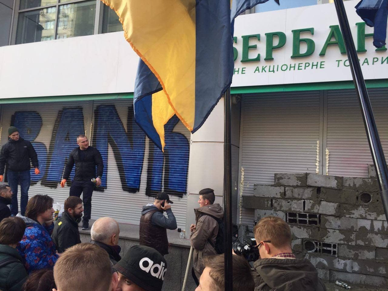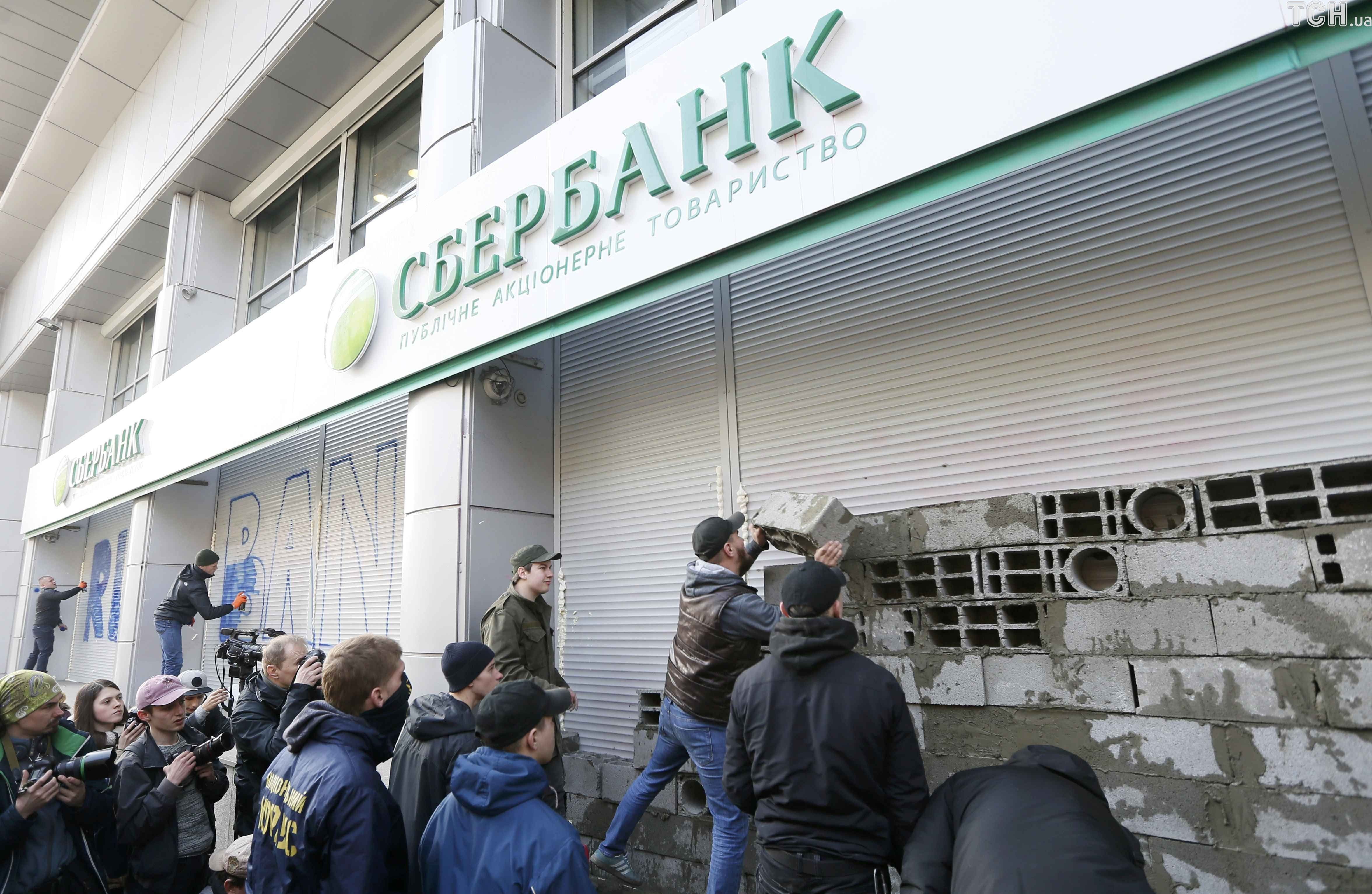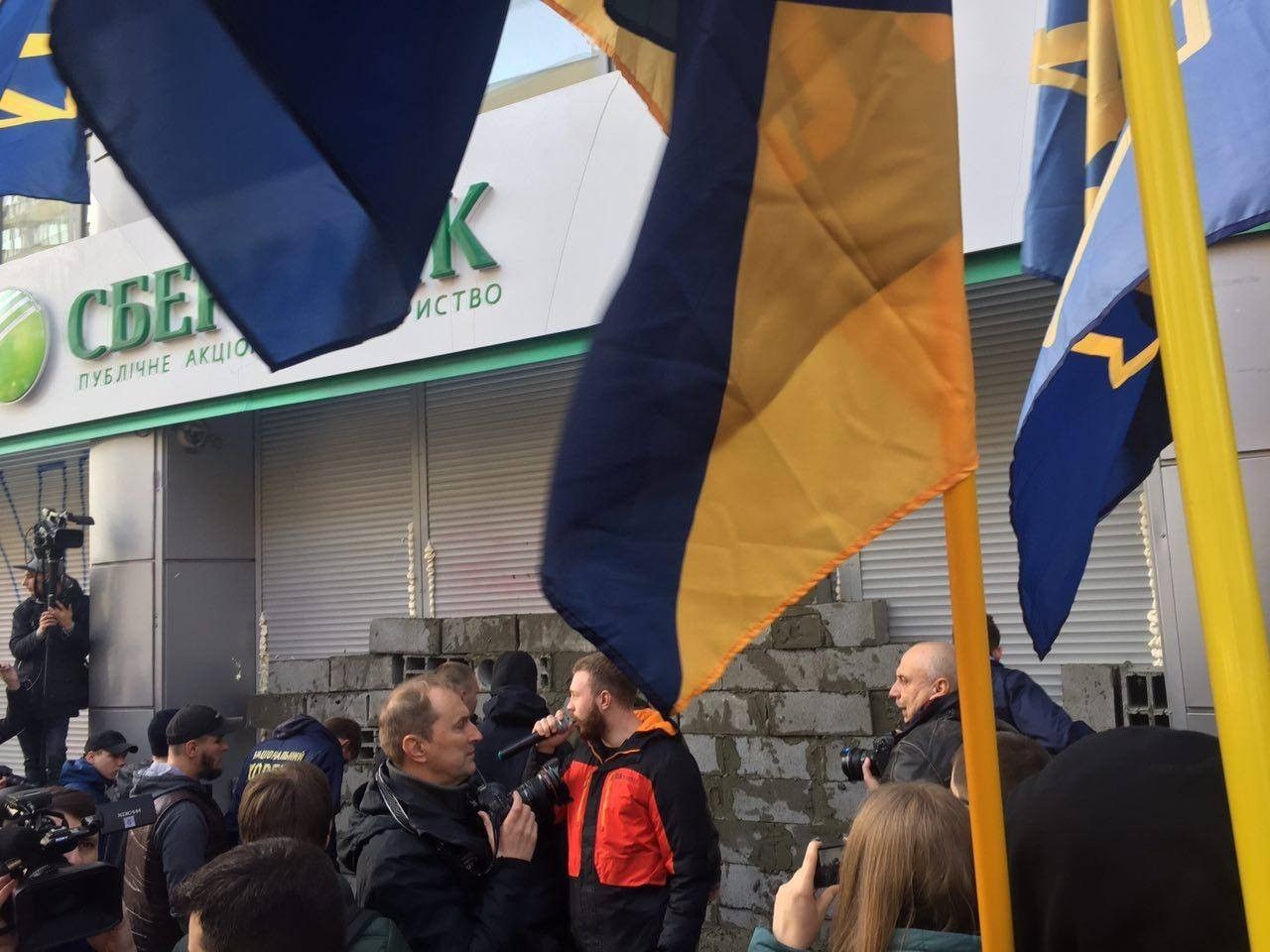 В эти минуты в Киеве активисты из "Национального корпуса" ("Азов") замуровывают цементом и бетонными блоками вход в центральный офис российского "Сбербанка". Кроме того, щели между рольставнями забрызгали монтажной пеной. Таким образом они требуют прекращения деятельности этого финучреждения на территории Украины.