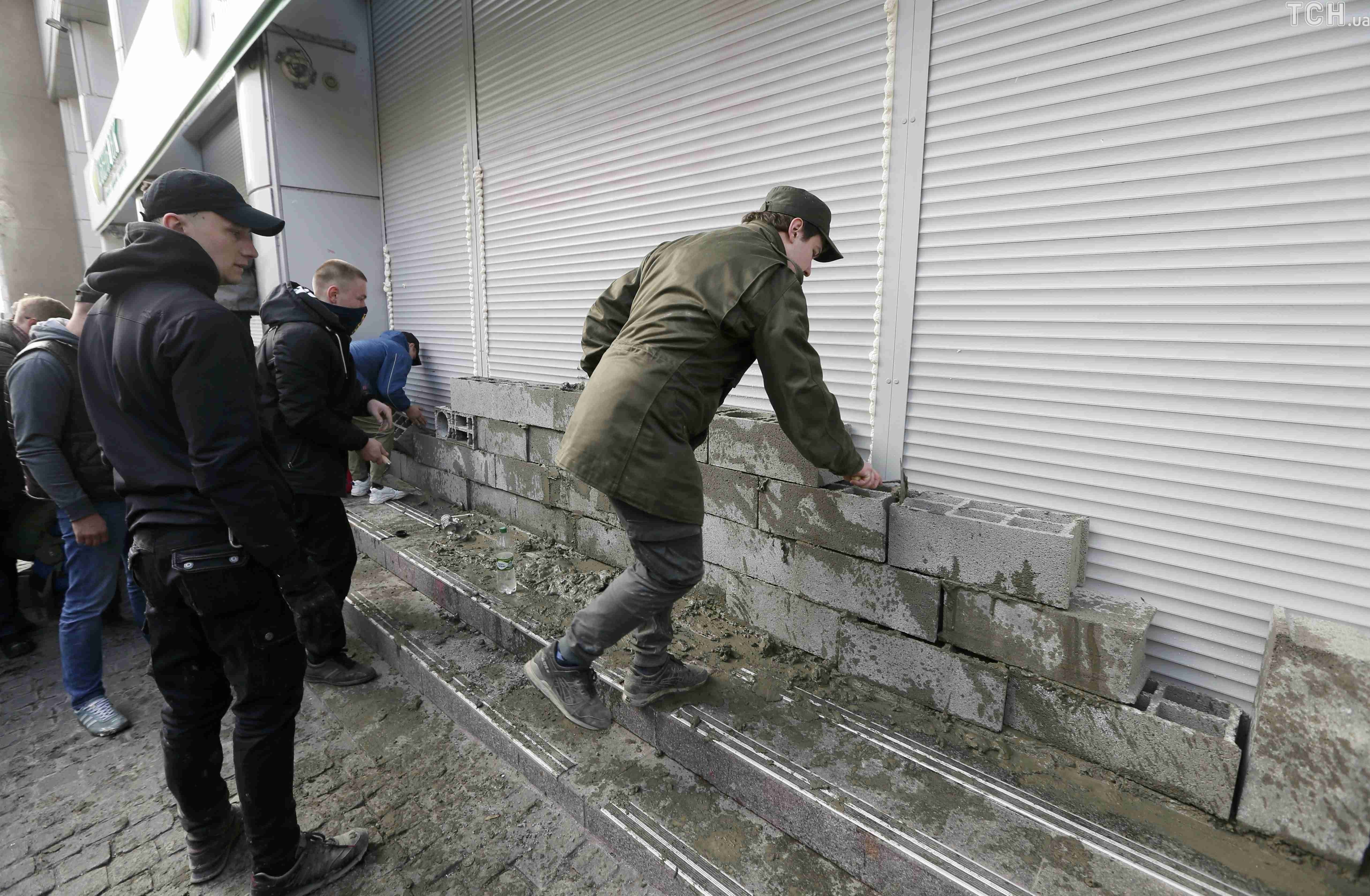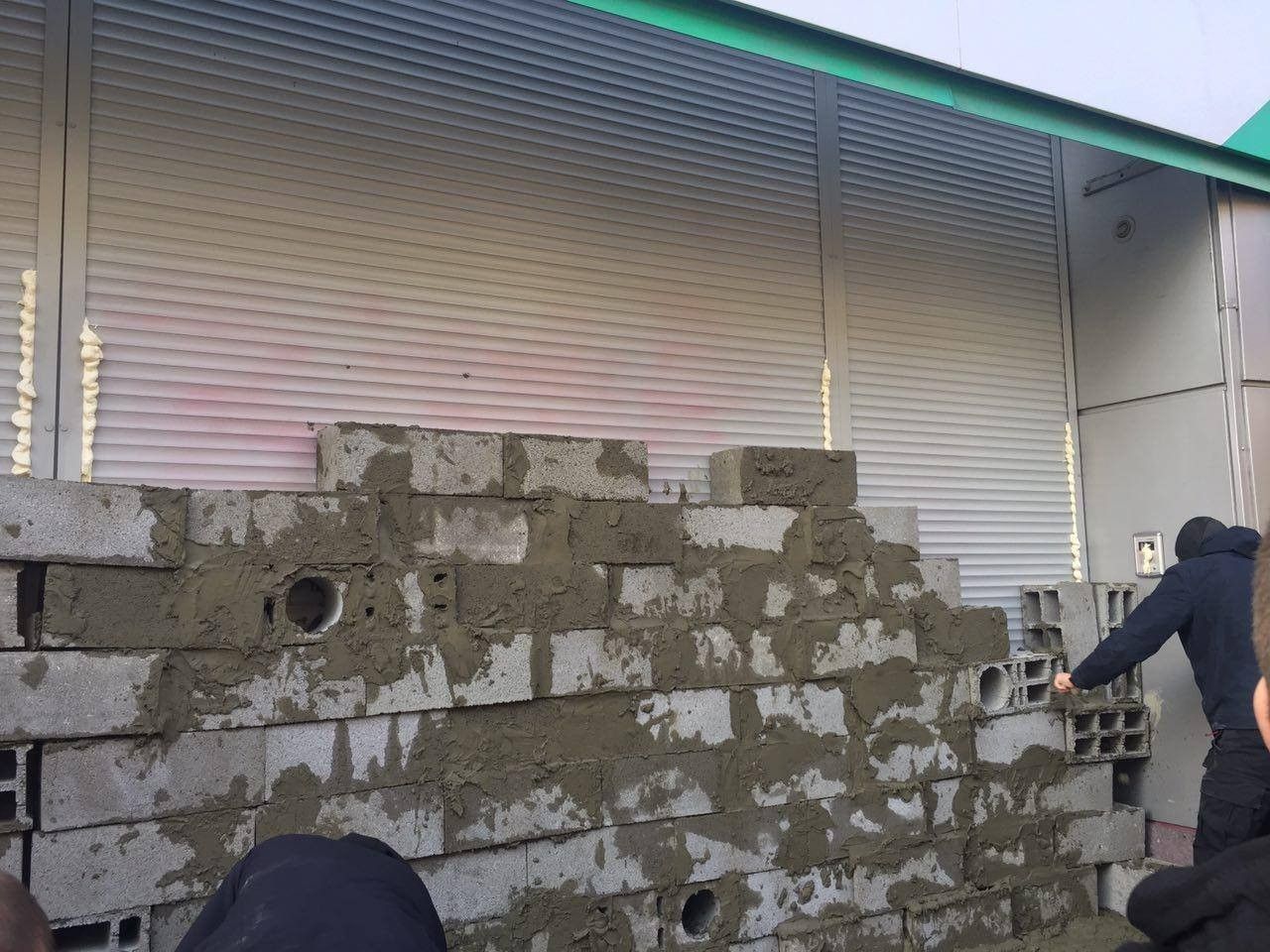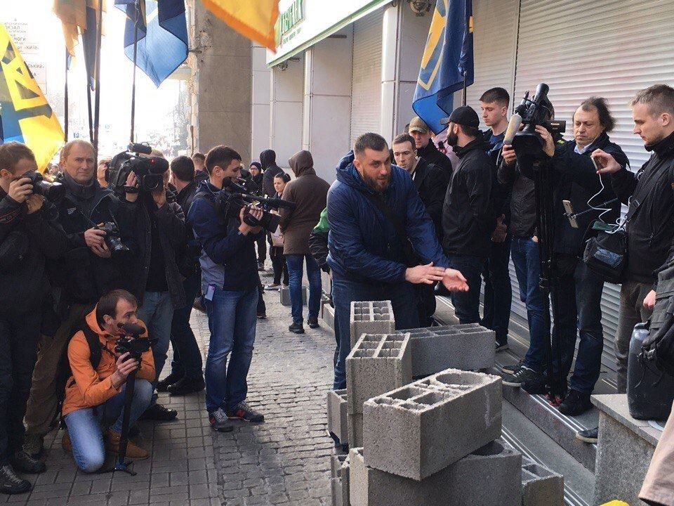 В Киеве активисты замуровывают бетонными блоками вход в центральный офис "Сбербанка"