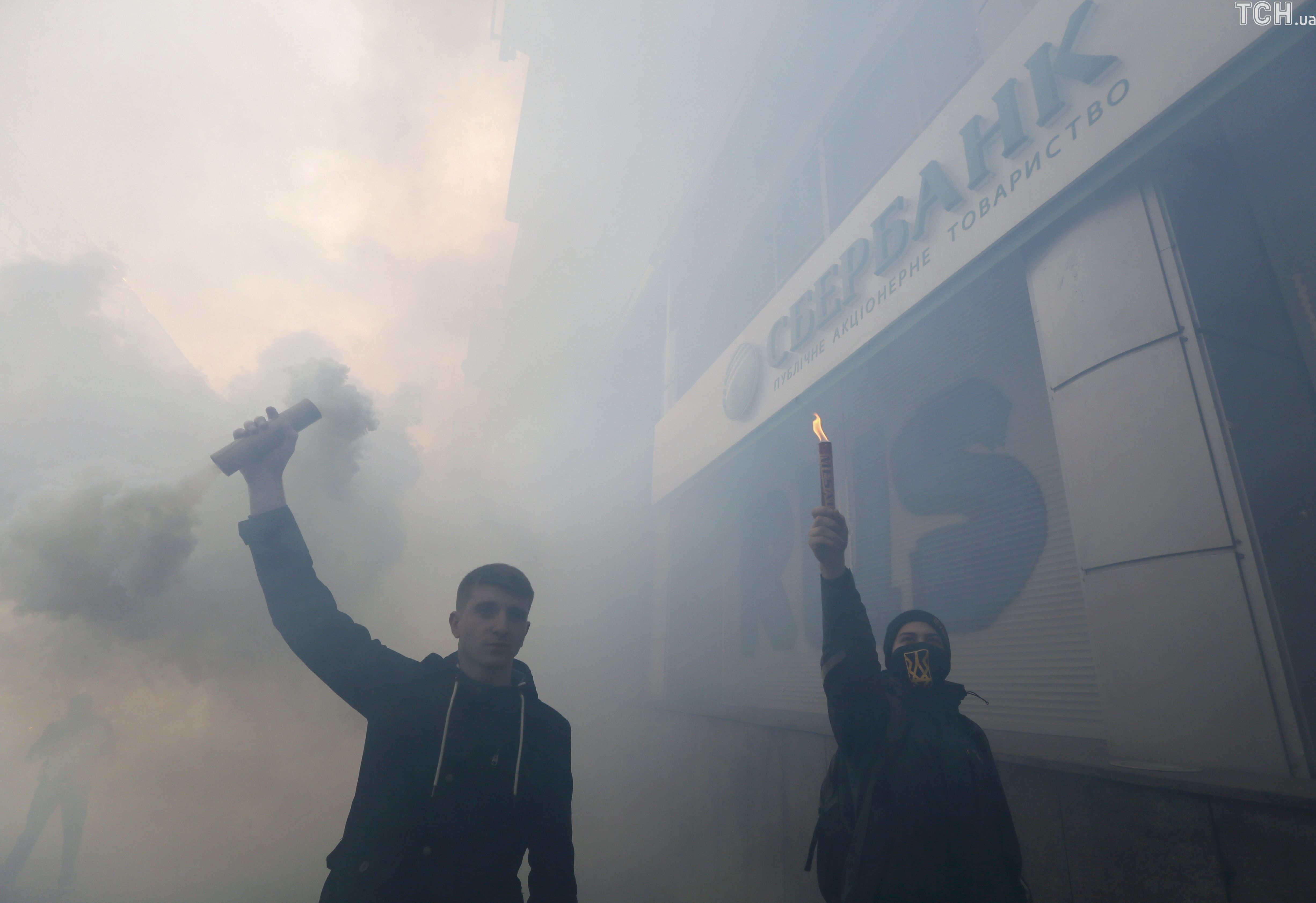 К блокировке "Сбербанка" также присоединились народные депутаты Украины Андрей Билецкий и Олег Петренко, передает azov.press. Они вместе с десятками мужчин подносят к стенам банка бетонные глыбы. Активисты скандируют: "Нет российским банкам!".