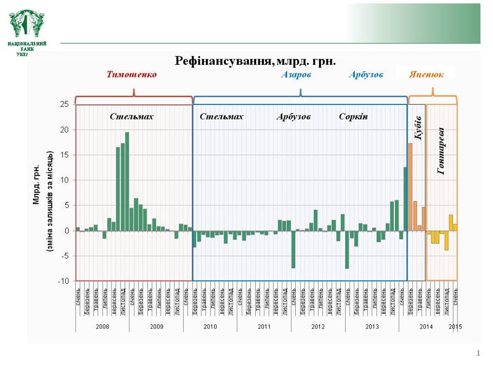 Председатель НБУ констатировала, что за прошлый год граждане забрали из банков 126 млрд грн. С начала текущего года эта сумма увеличилась еще на 18 млрд грн. Несмотря на то, что значительная часть этих оттоков является результатом паники, Национальный банк обязан поддерживать банки, предоставляя им кредиты рефинансирования, чтобы обеспечить своевременное проведение расчетов и возврата вкладов населению.