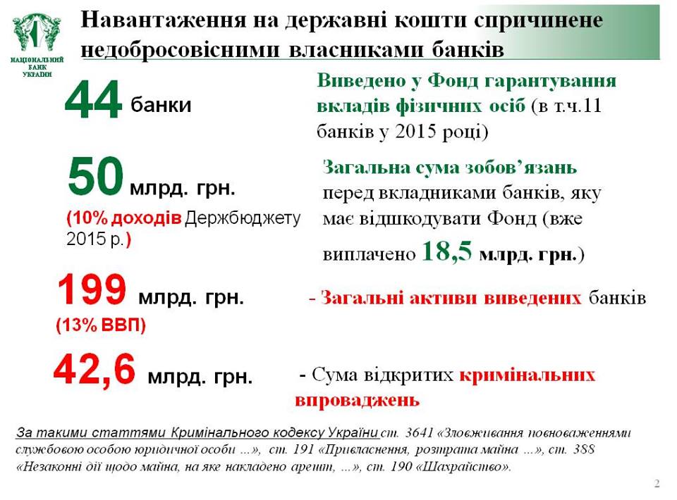 Гонтарева успела рассказать, что за 2014-2015 годы в Украине вывели с рынка 44 банка, 11 из них - только в этом году. По сути, банковская система потеряла почти 200 млрд грн, а это почти 9% ВВП государства. Из этой суммы только 50 млрд грн должно возместить государство через Фонд гарантирования вкладов физлиц. А это почти 10% дохода бюджета страны. По состоянию на 25 февраля вкладчикам неплатежеспособных банков уже было выплачено 18,5 млрд грн.