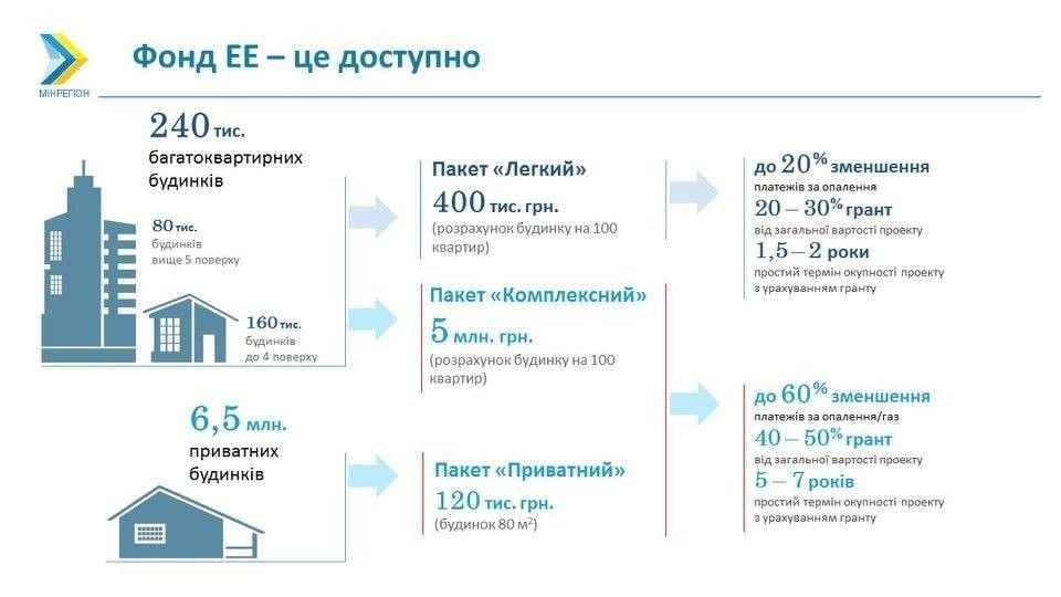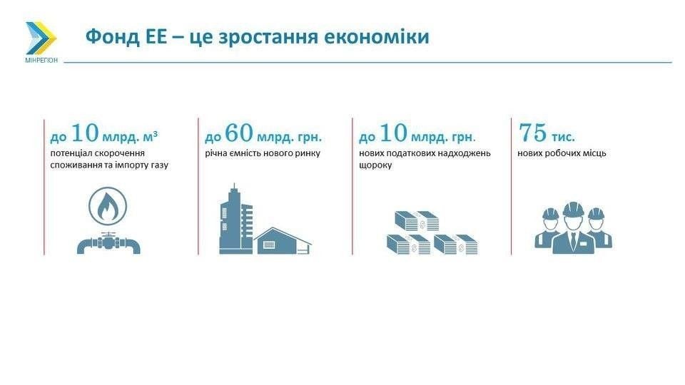 Благодаря Фонду энергоэффективности украинские домохозяйства во время реализации мероприятий по термомодернизации смогут сэкономить до 50% потребления энергоресурсов. Работа Фонда поможет сократить потери газа в системе теплоснабжения и в жилом секторе страны, которые ежегодно составляют 2,4 млрд кубометров и 9 млрд кубометров соответственно, создадут до 75 тыс. новых рабочих мест, а также за пять-восемь лет запустят рынок услуг в сфере энергоэффективности объемом около 30 млрд евро, главным участником которого будет малый и средний бизнес.