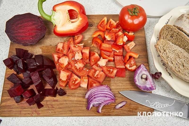 Сырую свеклу очистите и нарежьте кубиками. Томаты (2 шт.) и сладкий перец нарежьте крупными кусочками. Красный лук нарежьте тонкими полукольцами.