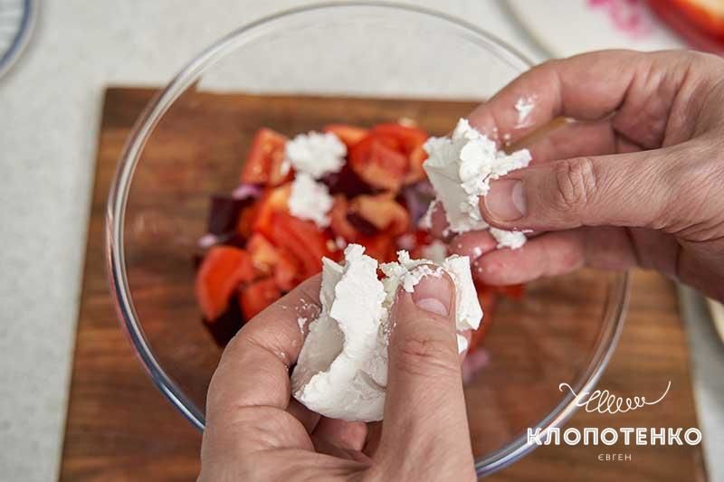 Выложите нарезанные овощи в большую миску. Сыр фета покрошите руками и добавьте в миску к овощам.