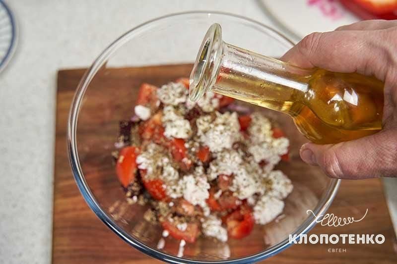 Заправьте салат 3 ст. л. оливкового масла. Немного перемешайте.