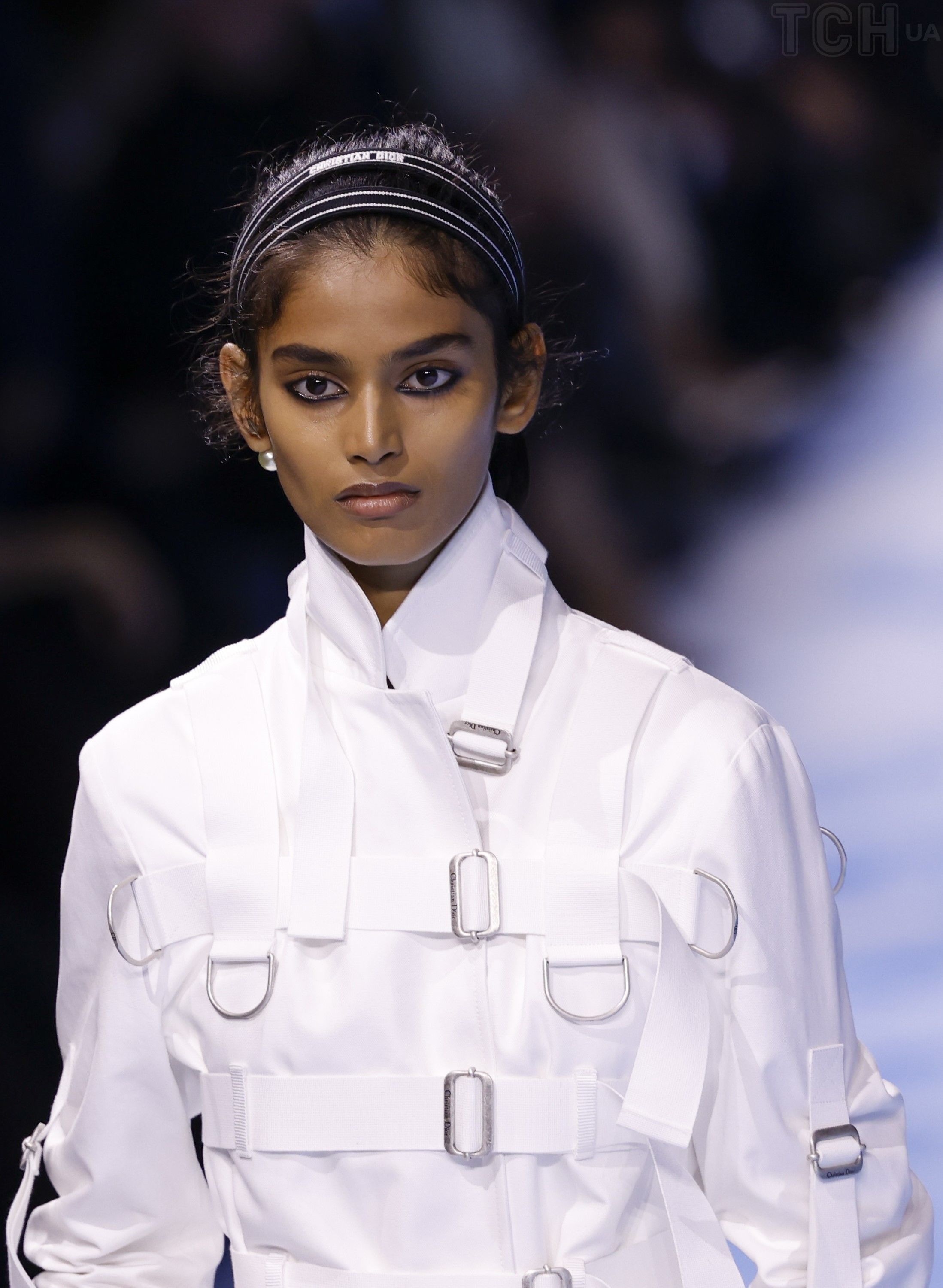Обувь на подиуме - отсылка к споту и Греции - модели носили новую интерпретацию гладиаторских сандалий. Также Кюри отказалась от цвета и представила только три оттенка: черный, белый и бежевый.