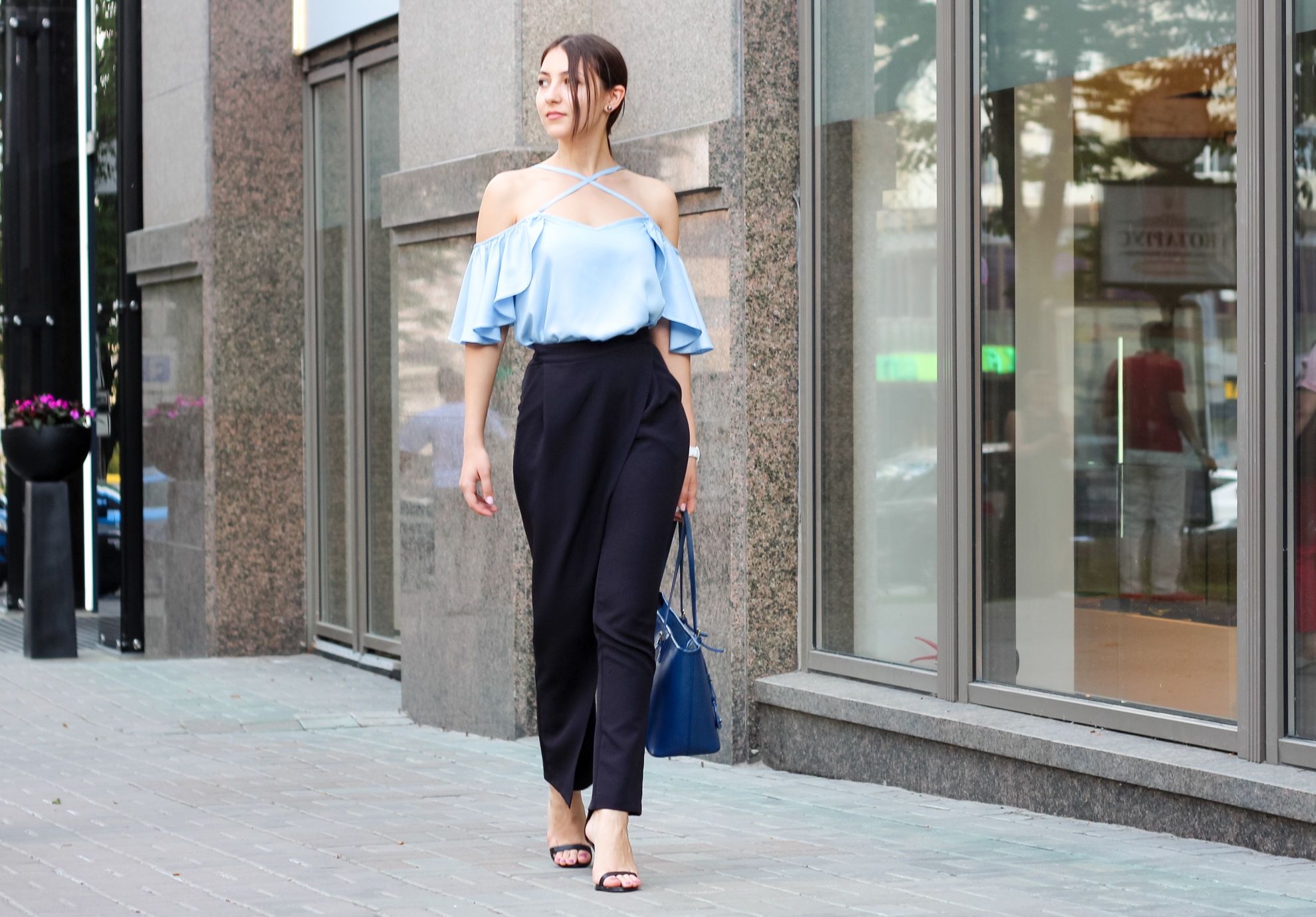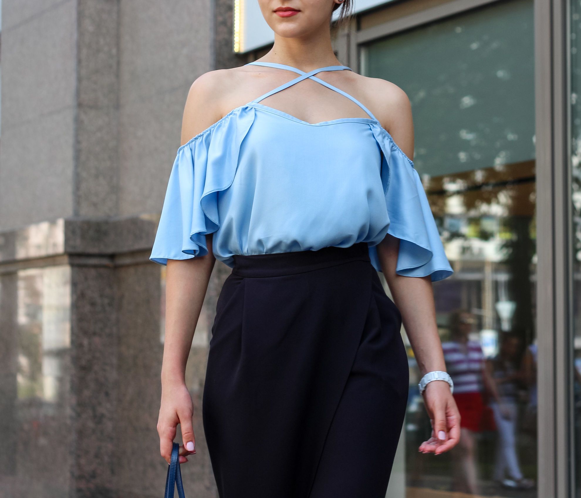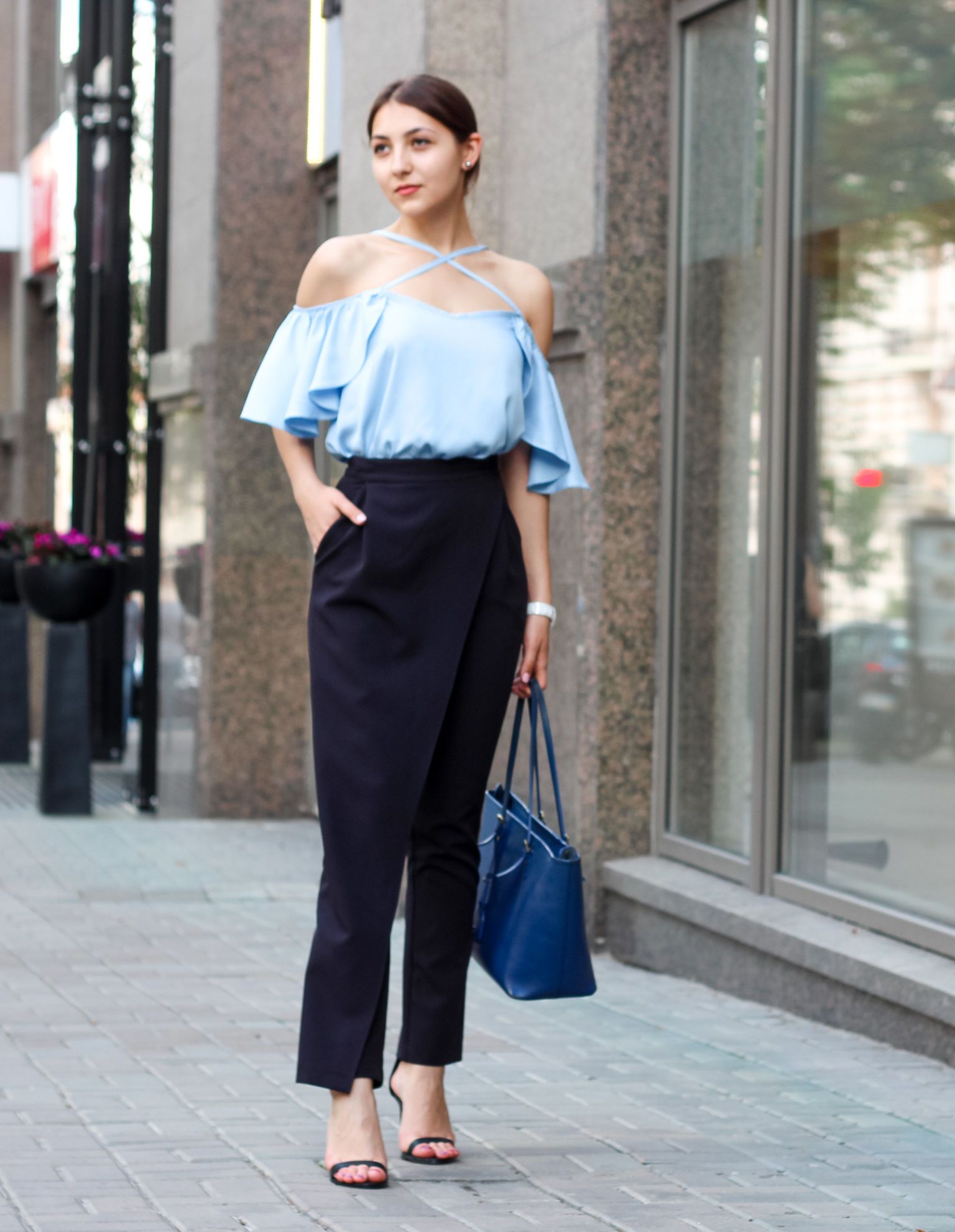 На работу в офис можно надеть топ с воланами и строгие брюки на запах, дополнив образ босоножками на небольшом каблуке, часами и сумкой.