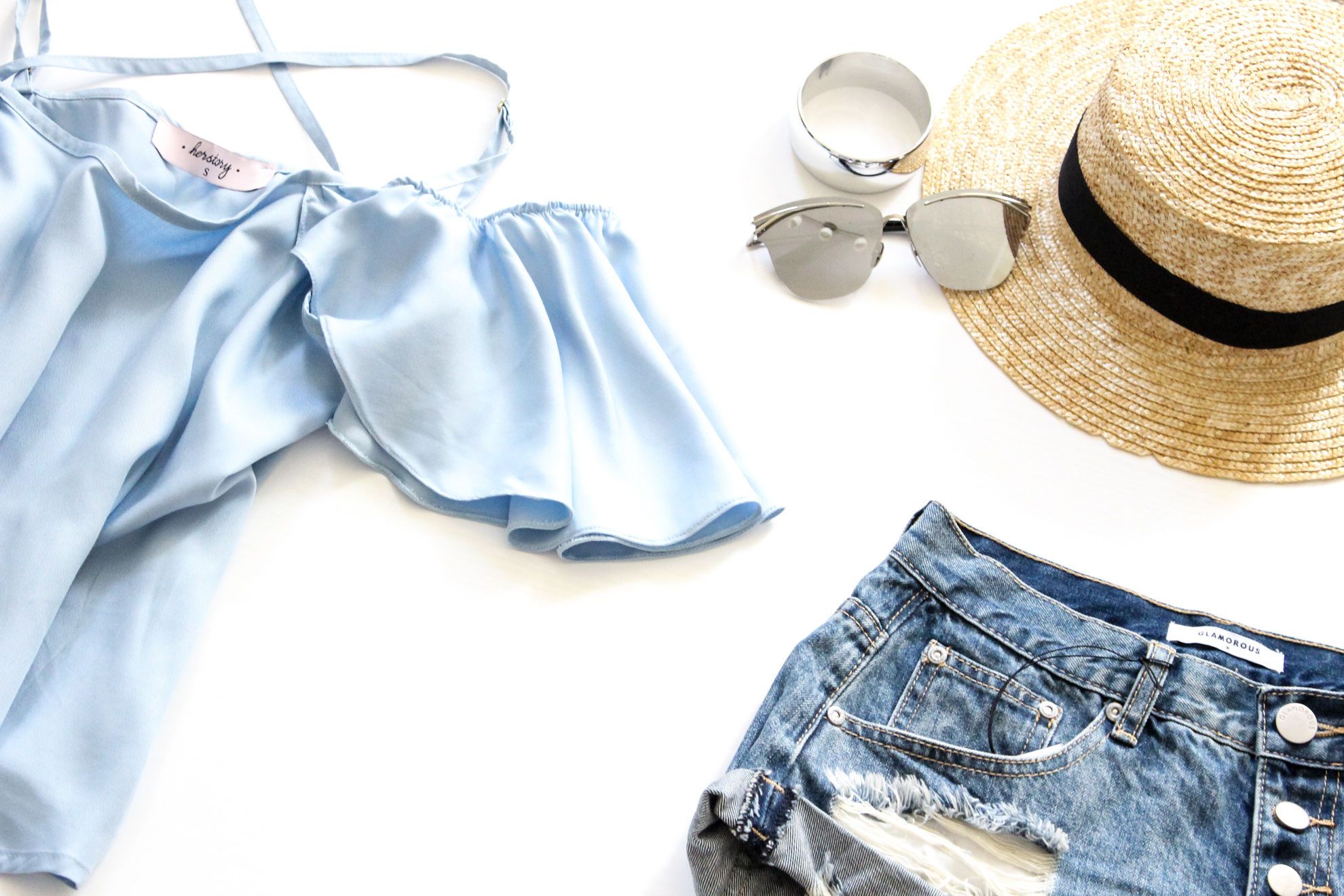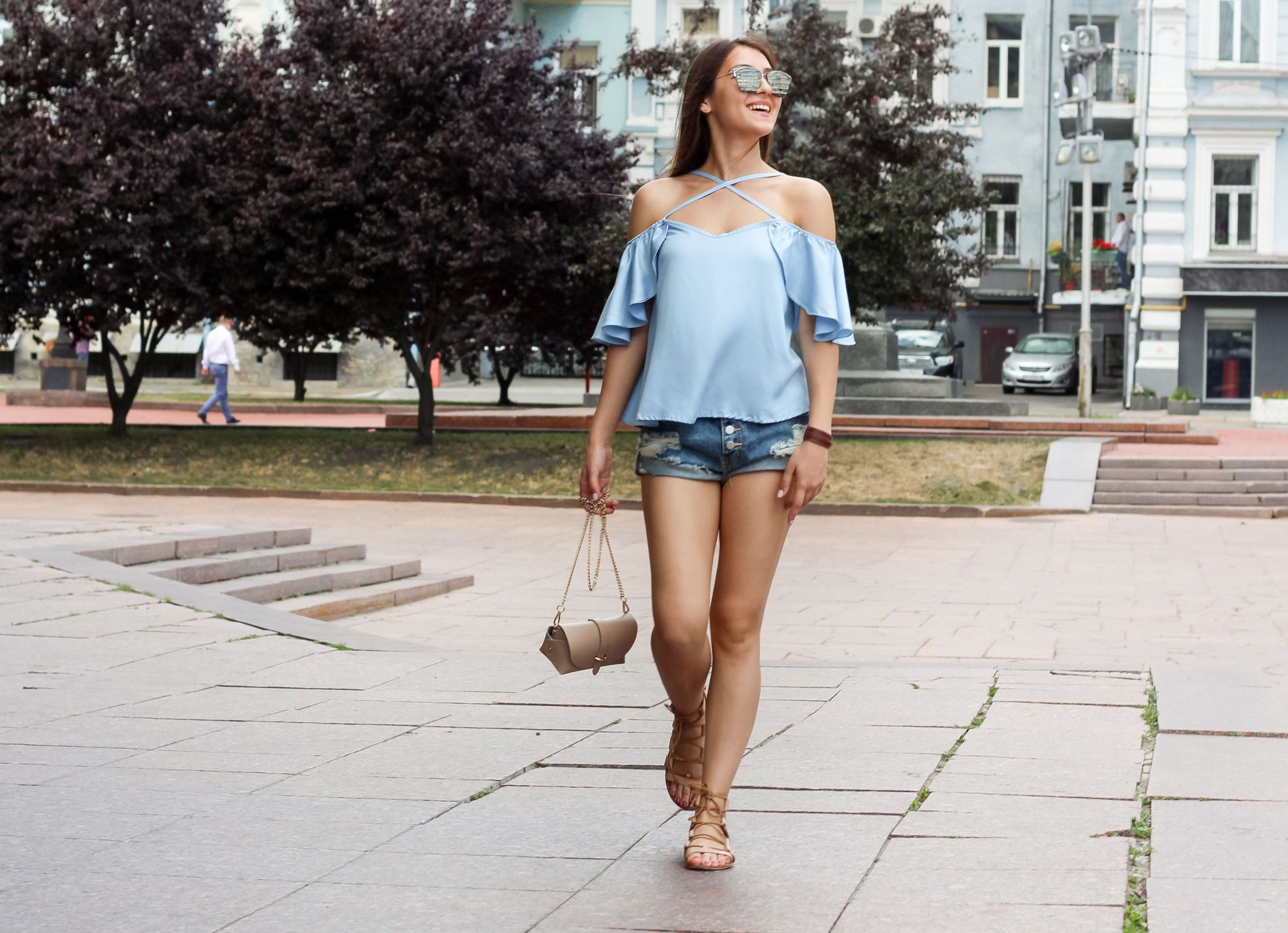 Для прогулки с подругами можно использовать этот же топ, только скомбинировать его с джинсовыми шортами. К наряду идеально подойдет небольшой клатч на цепочке и удобные сандалии. Стильные солнцезащитные очки придадут образу некой изюминки.