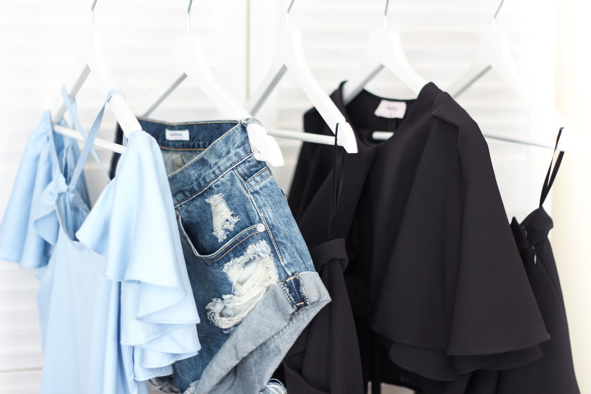 Екатерина предложила нам рассмотреть летний гардероб-трансформер на примере пяти вещей: нежного топа с воланами, джинсовыми шортами, строгими брюками на запах, юбкой-шортами и строгим топом с объемными рукавами.