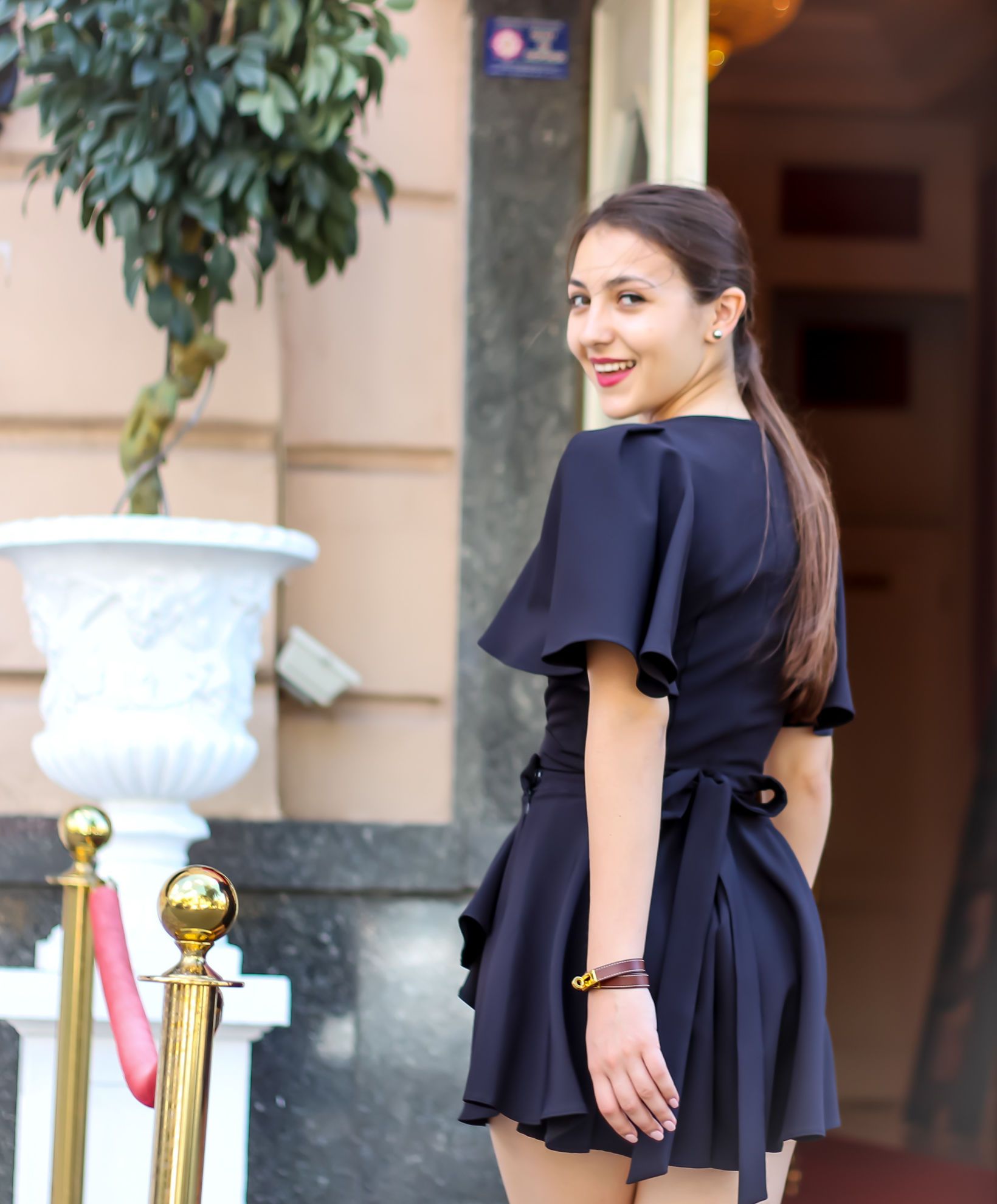 Ну а если вы планируете посетить какой-нибудь светский вечер или пойти в театр, то сочетание топа с объемными рукавами и брюк с запахом сделают ваш образ строгим, но стильным. Наряд можно дополнить лаконичными украшениями.